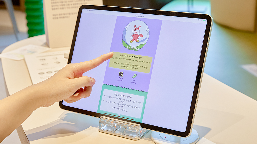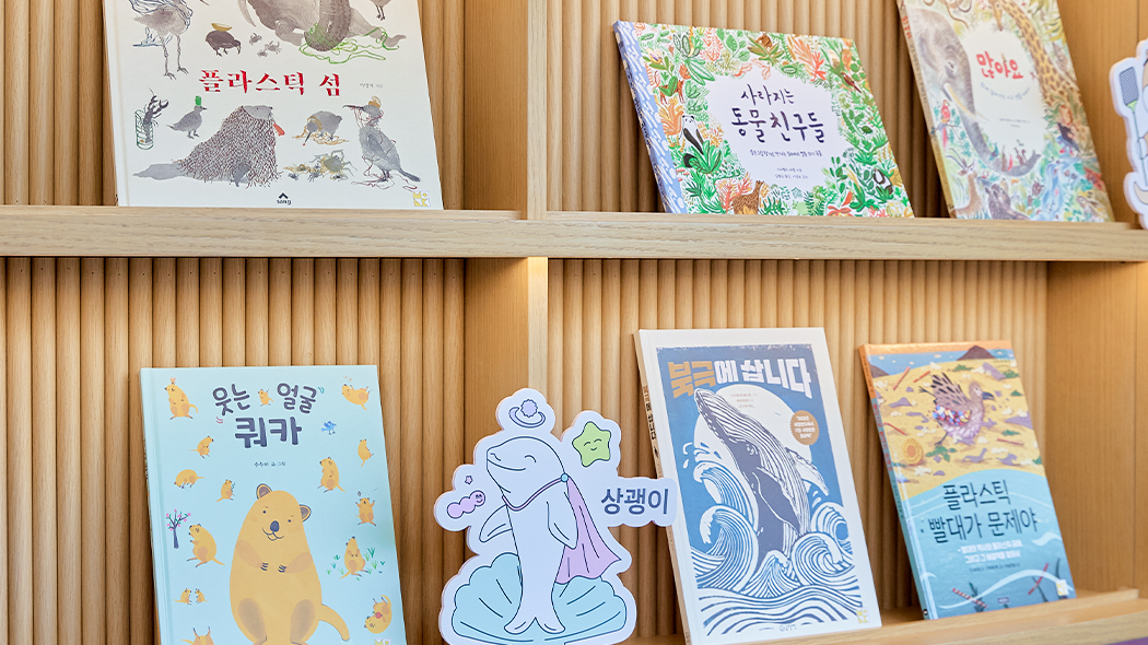 게이트를 거쳐 LAMINA 라이브러리로 들어오면 멸종위기 동물이 그려진 종이에 색연필로 색을 칠하고, 현대어린이책미술관MOKA가 큐레이션한 멸종위기 동물 관련 그림책을 읽으며 생물다양성의 중요성을 학습할 수 있습니다.