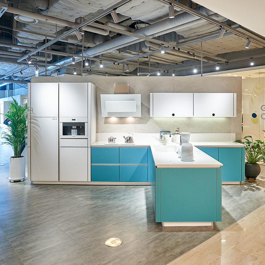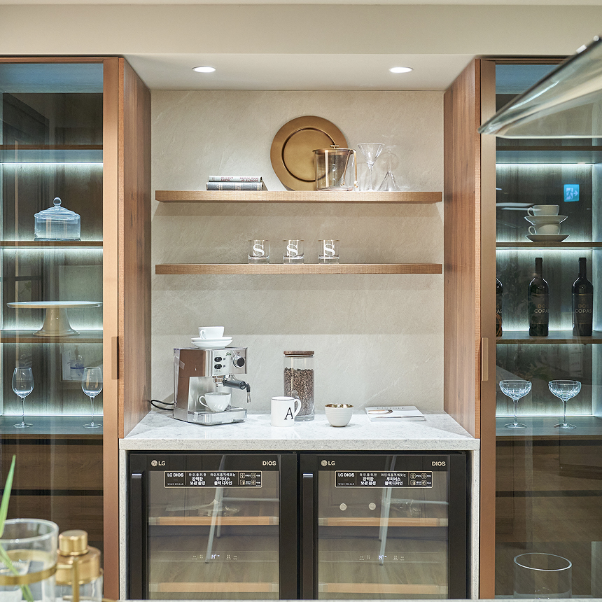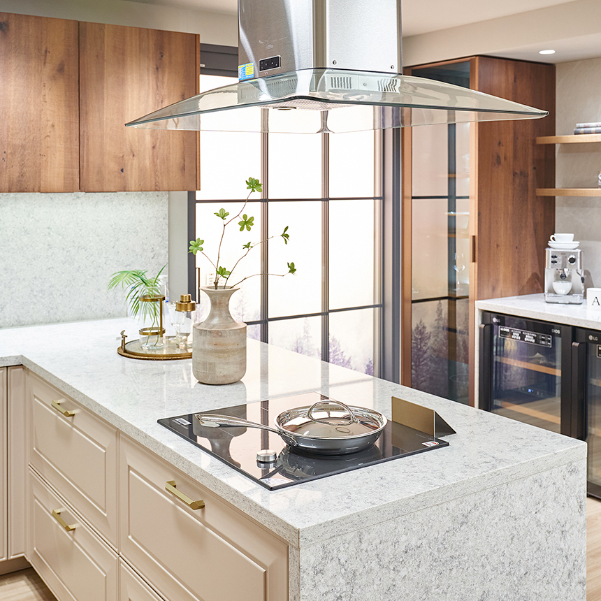 먼저, 매장 입구의 고급스러운 아일랜드가 눈길을 사로잡는데요. 독립형 아일랜드에 설치된 와이드 쿡탑으로 요리는 편리하게, 동선은 효율적으로 만들어보세요. 여기에 사용 후 감쪽같이 사라지는 다운 드래프트 후드를 더하면 공간도 넓게 쓰고 심플한 아름다움은 더해집니다.