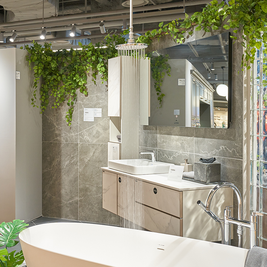 이제 리바트 바스 공간으로 넘어 가 볼텐데요. ‘테라’는 최상위 클래스를 위한 욕실로 이탈리아산 최고급 세라믹과 스페인산 포세린 타일로 뛰어난 내구성을 갖춘 것은 기본, 유러피언 감성과 미학까지 함께 담았습니다. 아름답게 빛나는 세라믹의 천연 마블 카라카타 패턴을 이어받는 듯한 포세린 타일의 문양과의 조화도 돋보입니다. 세라믹이 욕실 분위기를 밝게 해주는 반면 포세린의 상대적으로 진중한 색상은 욕실에 고급스러움과 함께 안정감을 더합니다. 수전을 돌리면 물까지 나오도록 준비되었으니 매장에서 유럽만의 감성을 직접 체험해보세요.