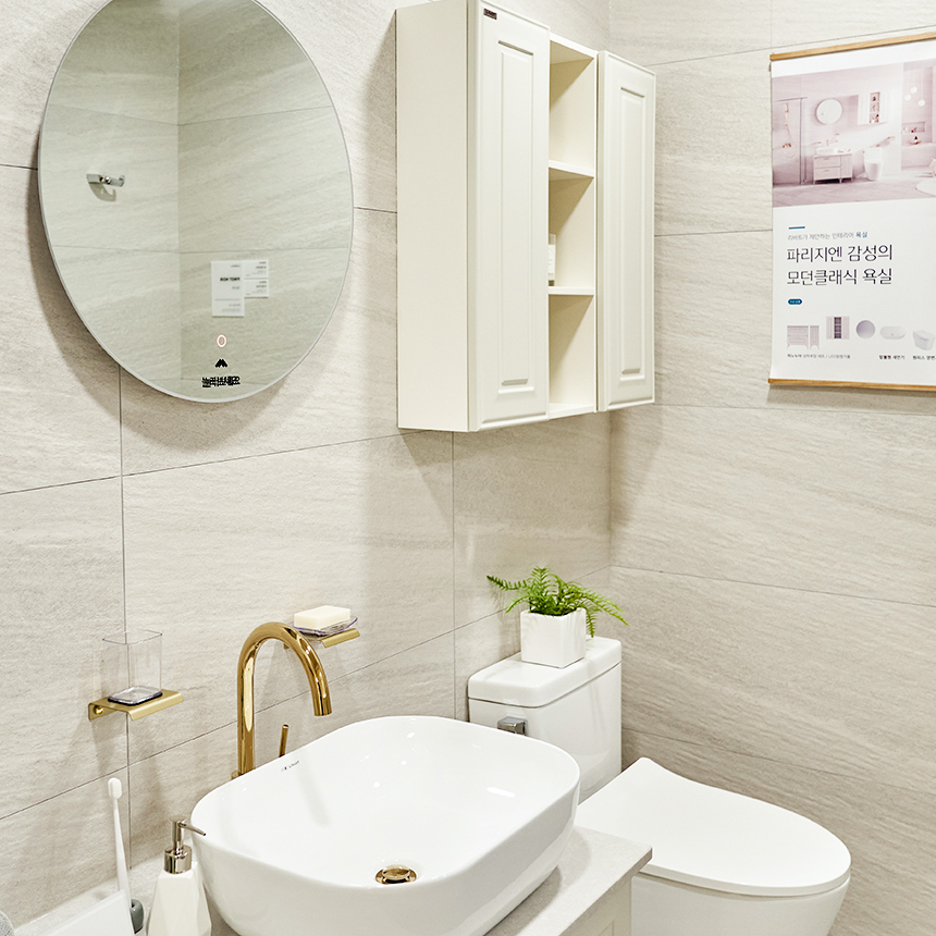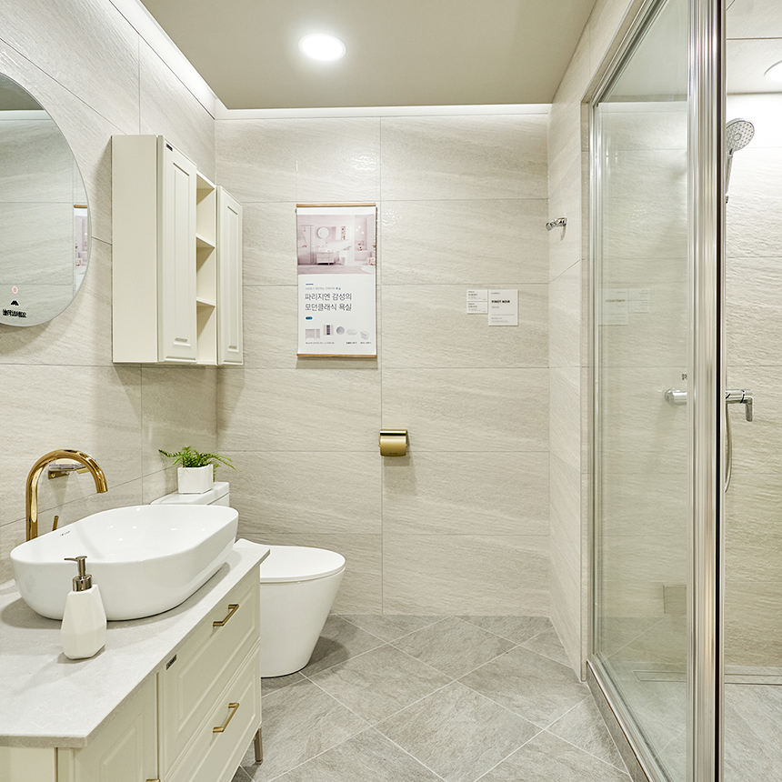 ‘시애틀’은 시크한 그레이톤과 넓은 스케일감으로 모던한 감각을 한껏 올렸습니다. 넓은 바닥 타일은 욕실 공간을 더욱 넓고 쾌적하게 만들어 주고 벽타일에는 자연스러운 질감이 살아있네요. 간결함과 모던함이 드러나는 수전과 액세서리는 고급 호텔을 떠올리게 하죠. 도드라지지 않는 언더 카운터 세면대와 매립 욕조의 일체감까지, ‘시애틀’은 여행에서 누리는 것과 같은 휴식을 더해줍니다.