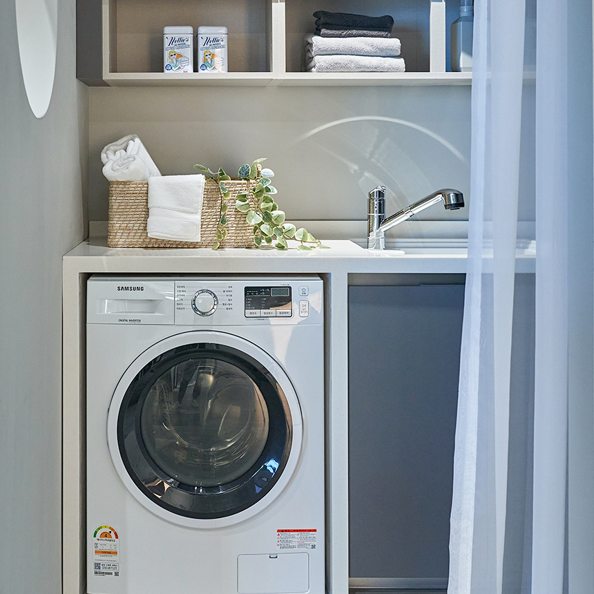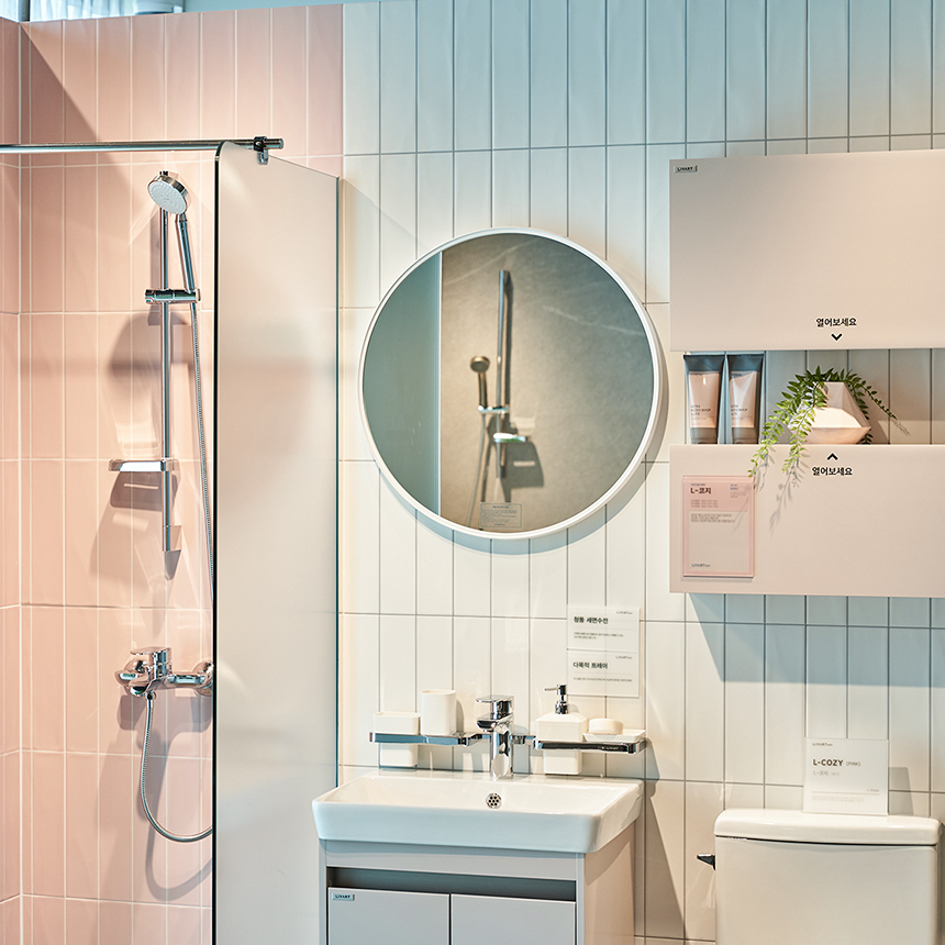 밝은 채광 속 산뜻한 핑크가 돋보이는 ‘L-코지’는 화이트 베이스에 부드러운 색감을 더해 편안한 욕실을 보여줍니다. 핑크 컬러의 욕실장, 화이트 포인트 타일, 그리고 다시 샤워부스의 핑크 타일로 이어지는 톤온톤 매칭이 ‘L-코지’만의 차별성을 잘 보여주네요. 그린 컬러도 준비되어 있으니 ‘리바트 플래너’와 함께 확인해보세요.