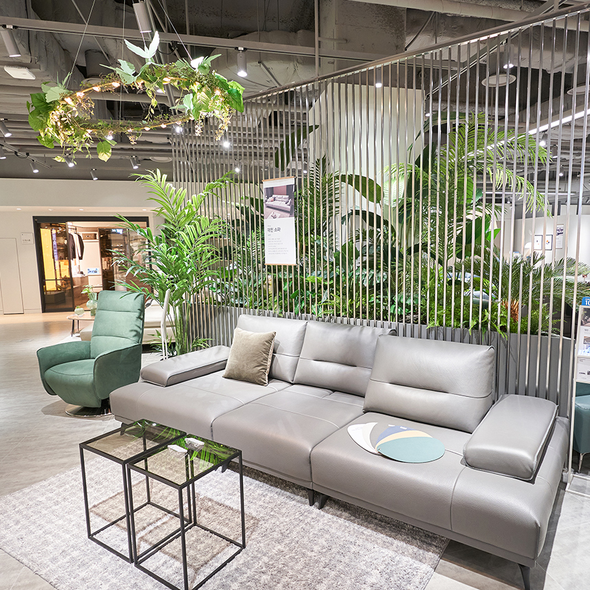입구부터 눈에 띄는 소파존부터 확인해 볼까요? 기존 리클라이너가 묵직하고 투박해서 부담스러웠던 분들을 위한 콤팩트하고 담담한 디자인을 실현한 리바트만의 ‘리클라이너’가 준비되어 있네요. 슬림한 라인과 바디 디자인은 리클라이너의 무거운 느낌을 덜어내면서도 리클라이너의 편리성을 높였습니다. 팔걸이 바깥쪽 손이 쉽게 가는 위치에 있는 작동 버튼으로 편리하게 편안함을 누려보세요.