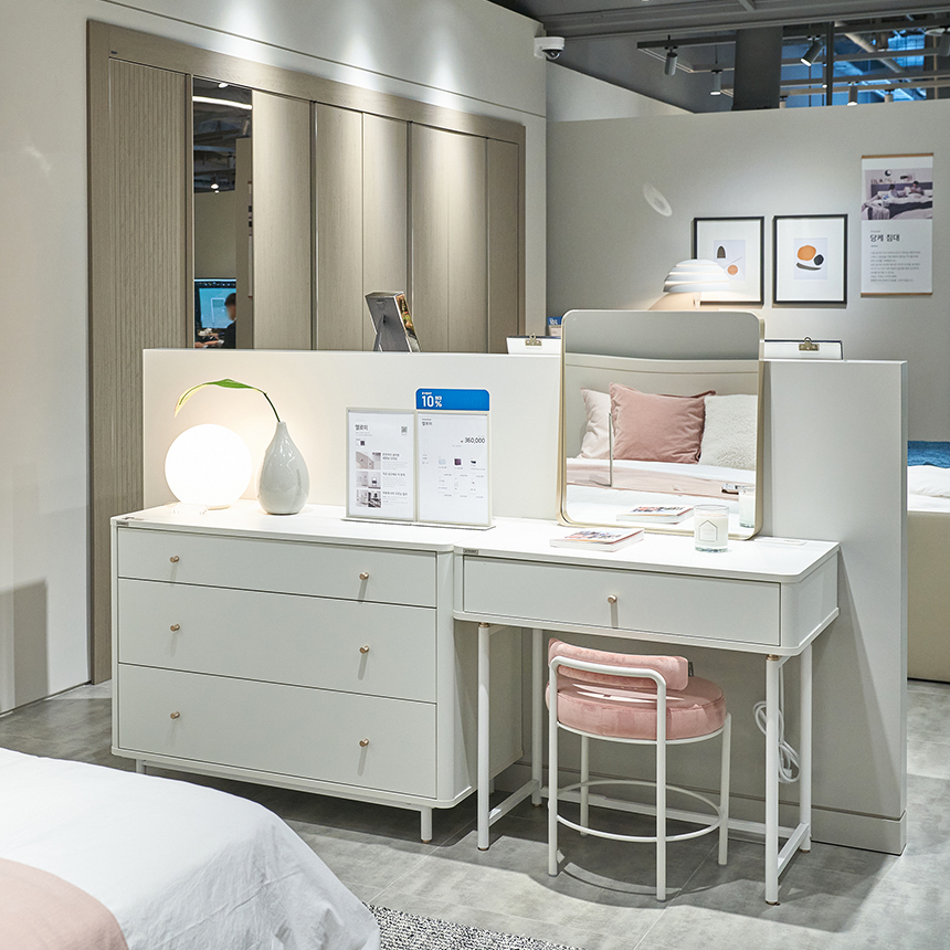 침실에 꼭 필요한 붙박이장과 화장대가 같이 배치되어 함께 확인할 수 있는 침실존에서는 이 침대를 꼭 주목해주세요. 두 개의 침대가 붙어 있는 독특한 형태의 침대, ‘당케 침대’는 출산을 앞두었거나 유아를 둔 가정에 최적인 침대입니다. 낮은 높이와 쿠션형 헤드로 아이에게는 안전하고, 아이가 자라 수면 독립을 하게 되면 작은 침대를 간단하게 분리할 수 있으니 실용성과 실속 면에서도 최고의 선택입니다.