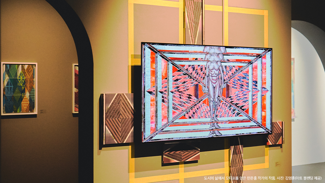 세 번째 섹션은 예상하던 대로 자유분방함이 가득하다. 바로 영화 <기생충> 속 자화상을 그린 지비지 작가의 공간이다. 이곳에서는 식물, 나무, 동물, 인간 등 주변의 자연을 모티프로 작업한 컬러풀한 캔버스 작품이 재기 발랄한 분위기를 내뿜는다. 뒤이어 민준홍 작가의 섹션도 눈길을 끈다. 영국과 한국을 오가며 탄탄하게 다져온 회화와 미디어 설치 장르의 신작이 주를 이룬다. 도시에서 발견한 사물과 풍경, 주변인들과의 관계를 드로잉, 영상 등 다양한 매체로 표현하는 민준홍 작가의 예술적 언어를 엿볼 수 있다.