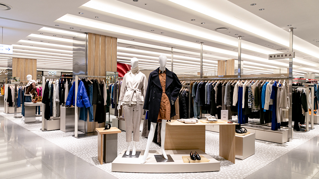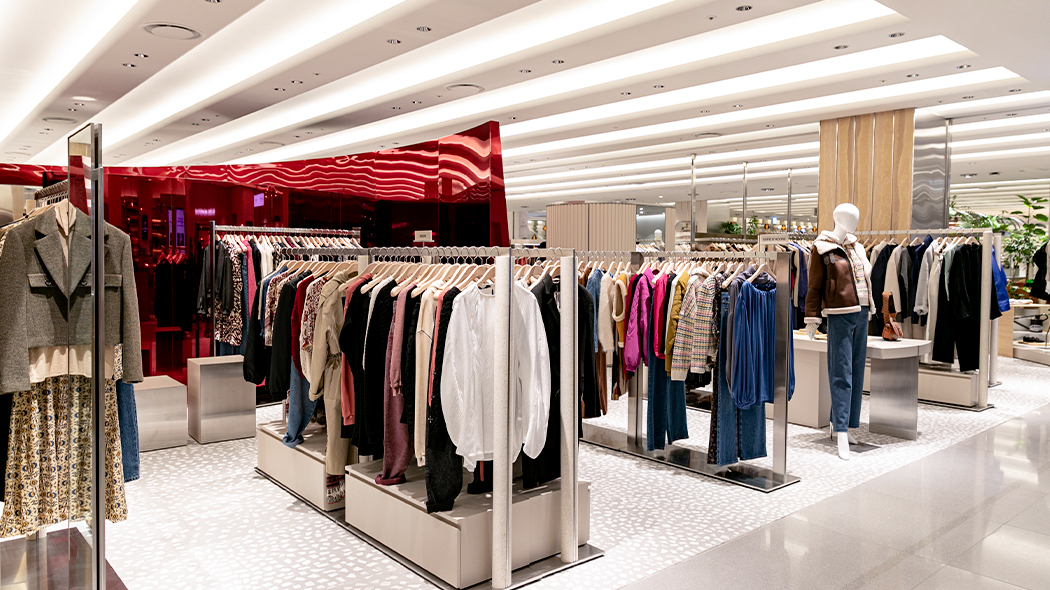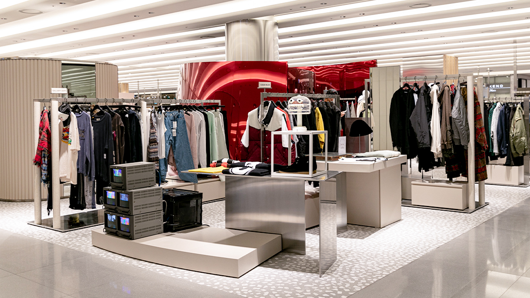 뮤제 피프스에 당도하자 메탈릭한 구조물이 시선을 압도합니다. 이를 통해 뮤제 피프스가 지향하는 트렌디한 톤 앤 매너를 통일성 있게 나타내는데요. 공간 전체가 개방감이 느껴지는 파티션으로 구획을 나누어, 각 브랜드의 아이덴티티는 확실하게 강조하면서도 시즌별 패션 트렌드를 자연스럽게 소구하여 다채로운 쇼핑 경험을 제공합니다.