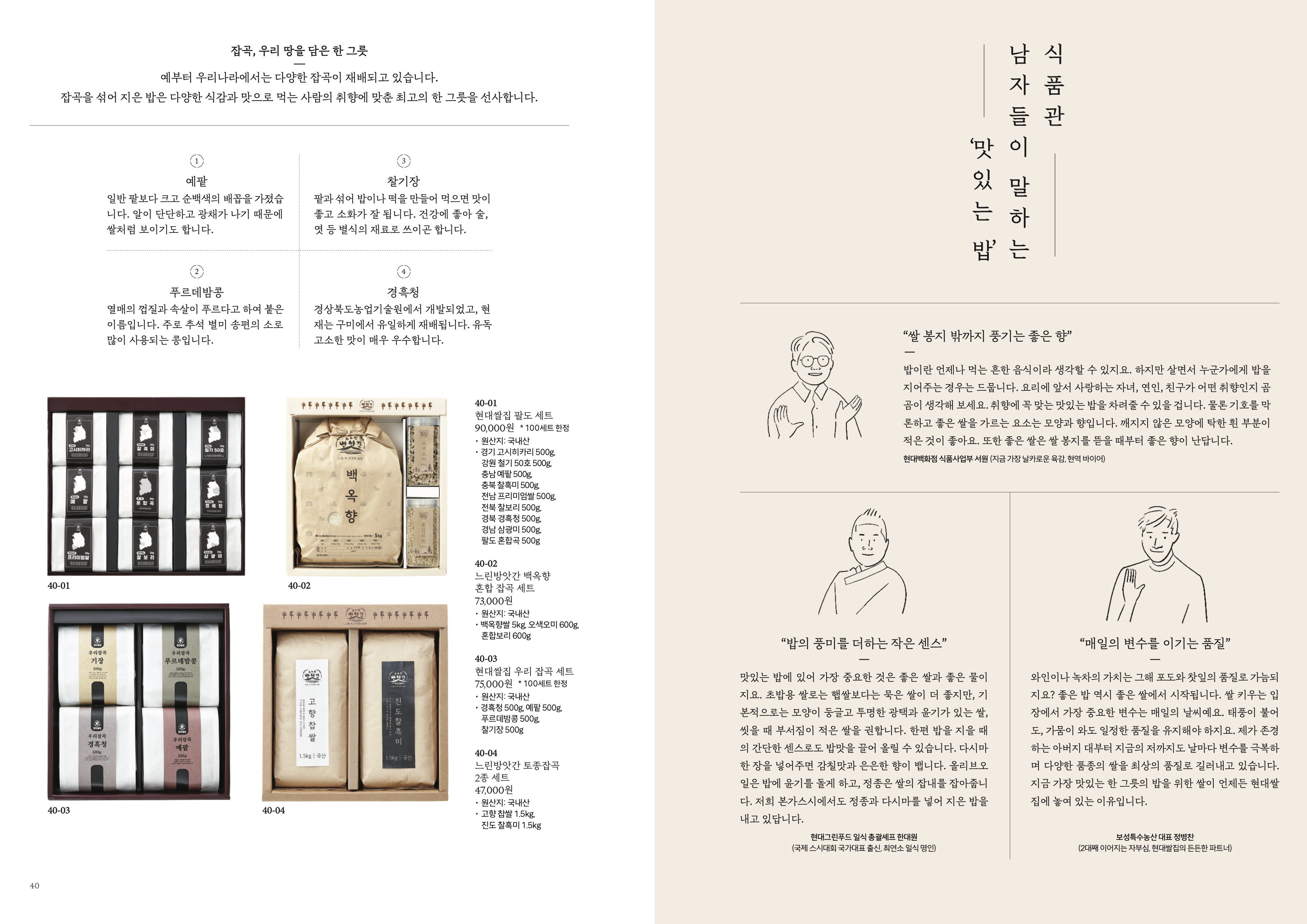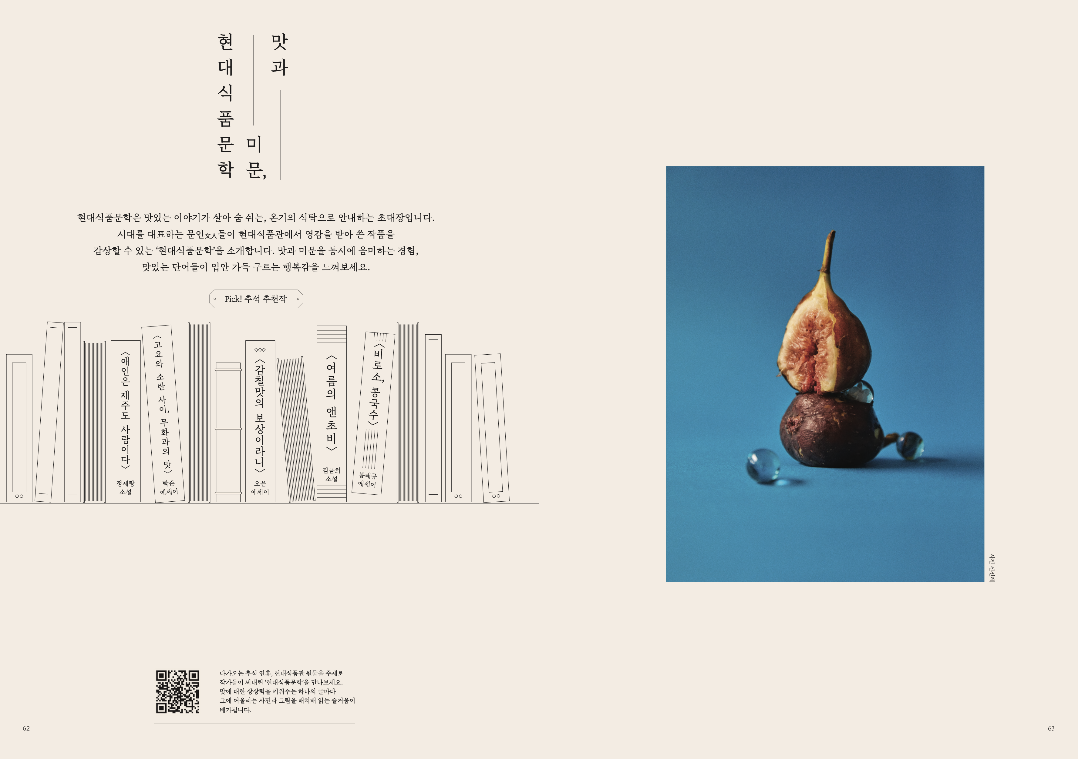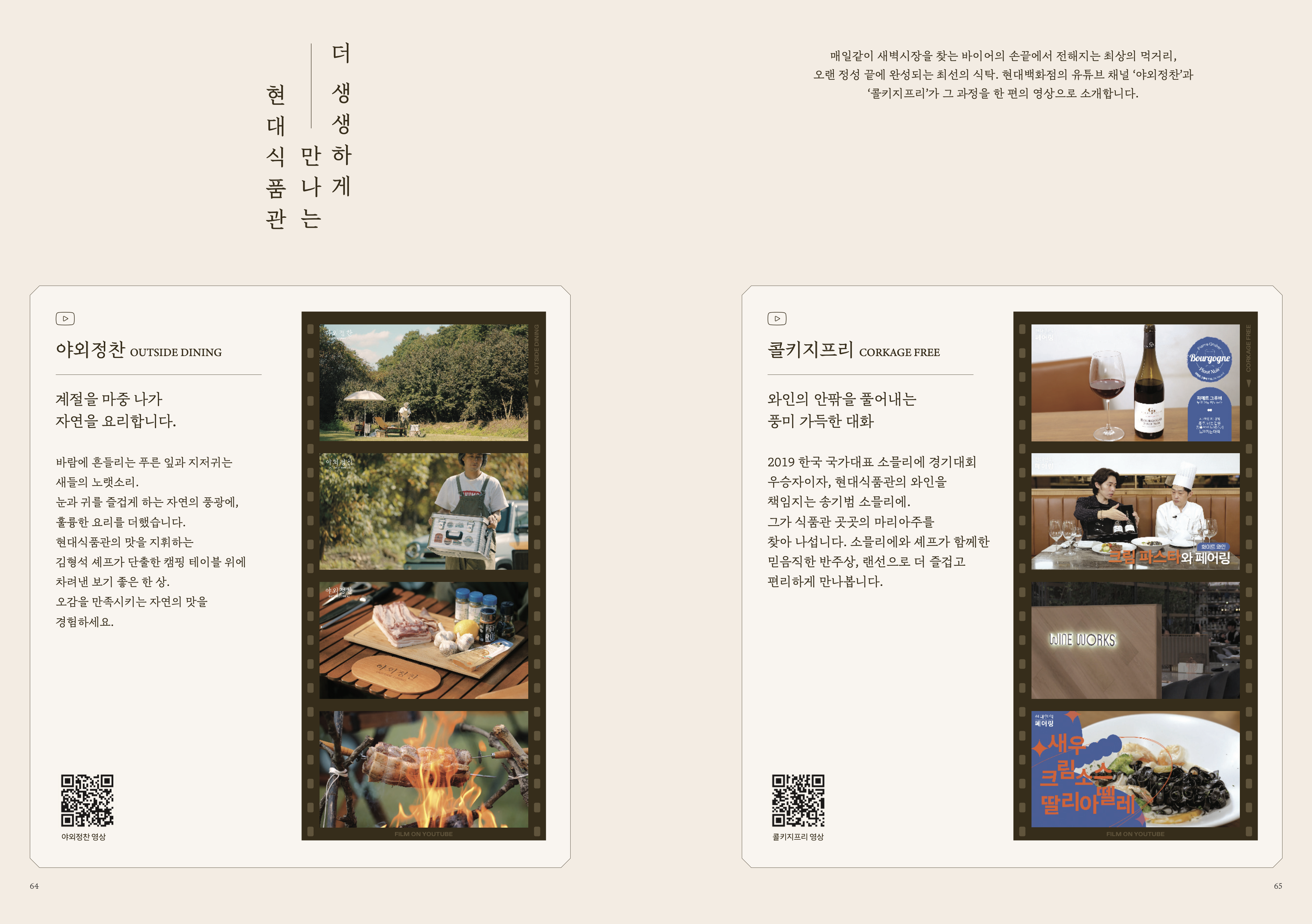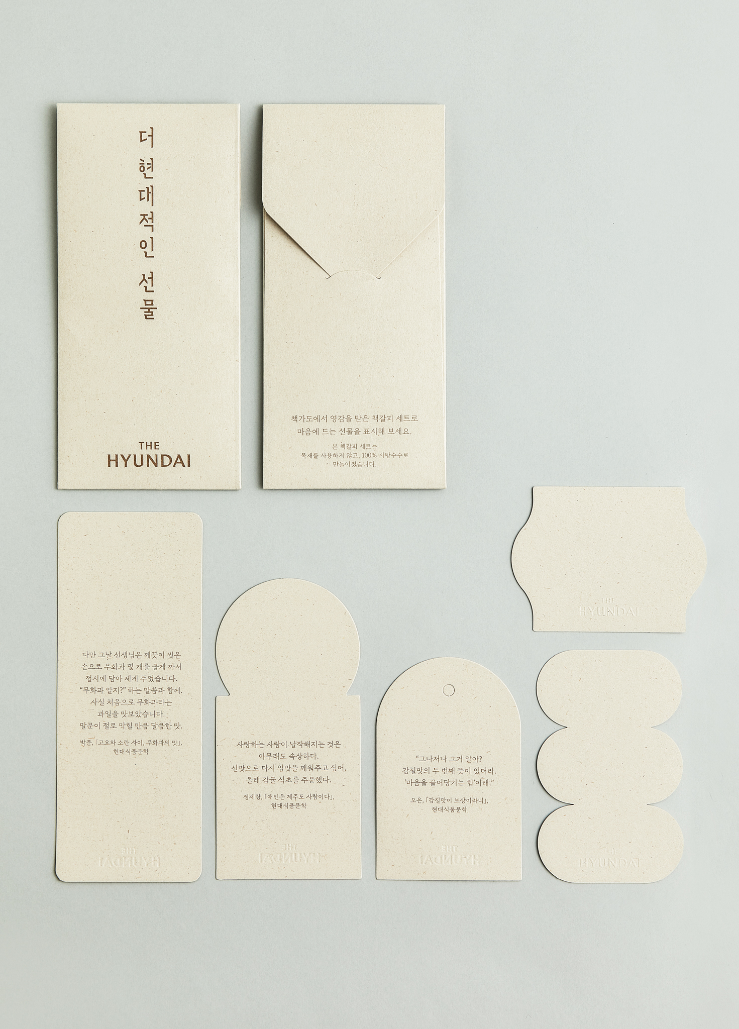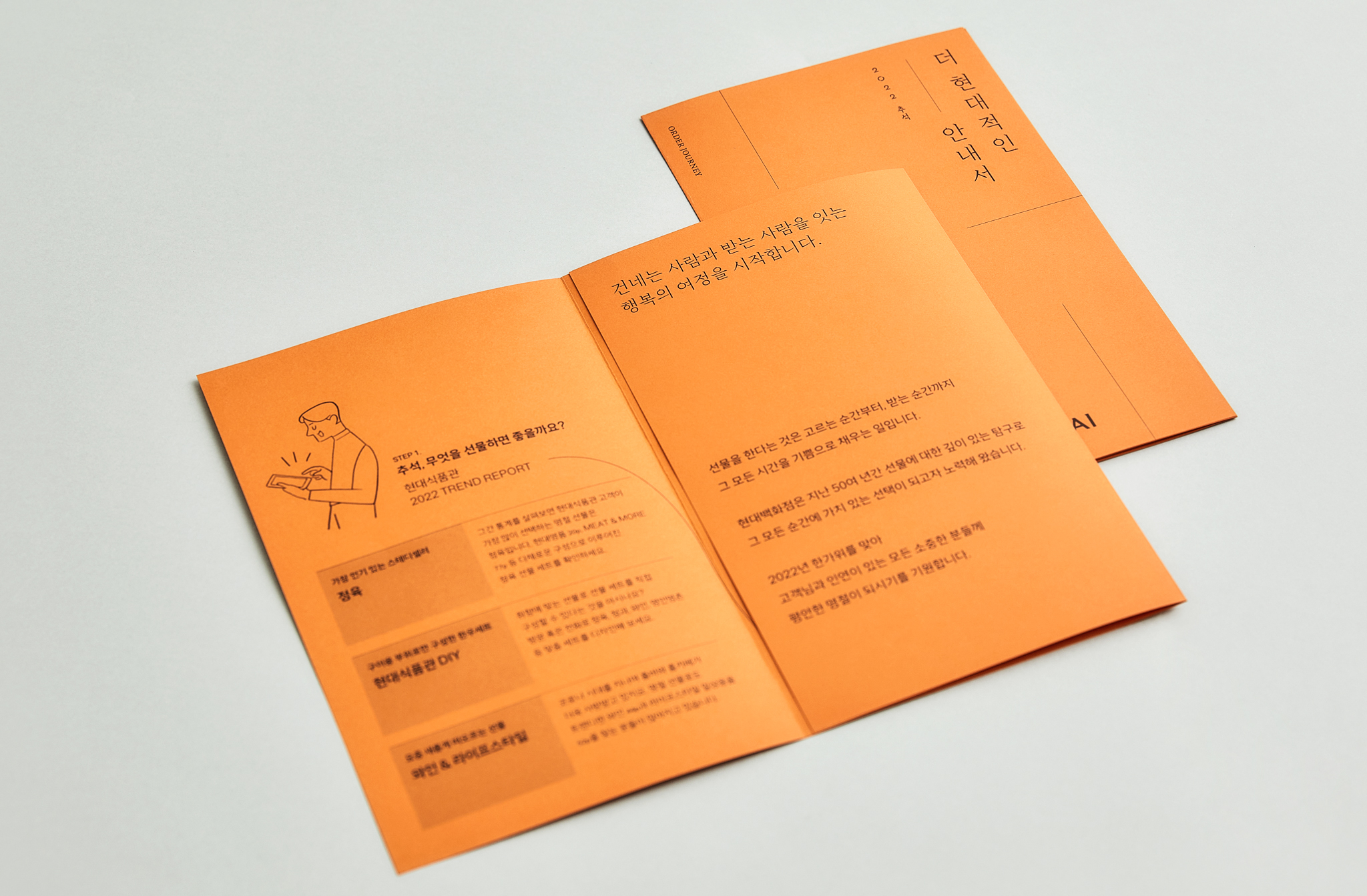 올해 선물집은 더욱 매끄러운 선물 경험을 선사하기 위해 본권, 안내서, 책갈피, 박스 패키지로 구성했습니다. 본권은 현대백화점의 선물이 만들어지는 과정부터 정육과 청과, 라이프스타일 제품군에 이르는 선물, 추석 선물에 관한 볼거리와 읽을거리를 담았습니다. 안내서는 바이어가 직접 정리한 Q&A를 수록해 주문 과정을 돕습니다. 책갈피는 많은 선물 중 원하는 선물을 표시해 두게 되는 선물집의 사용자 경험을 더욱 풍성하게 합니다. 한국의 문학가들이 현대식품관의 원물을 주제로 창작한 <현대식품문학>에서 추석과 관련된 구절을 새겨 의미를 더했습니다.
