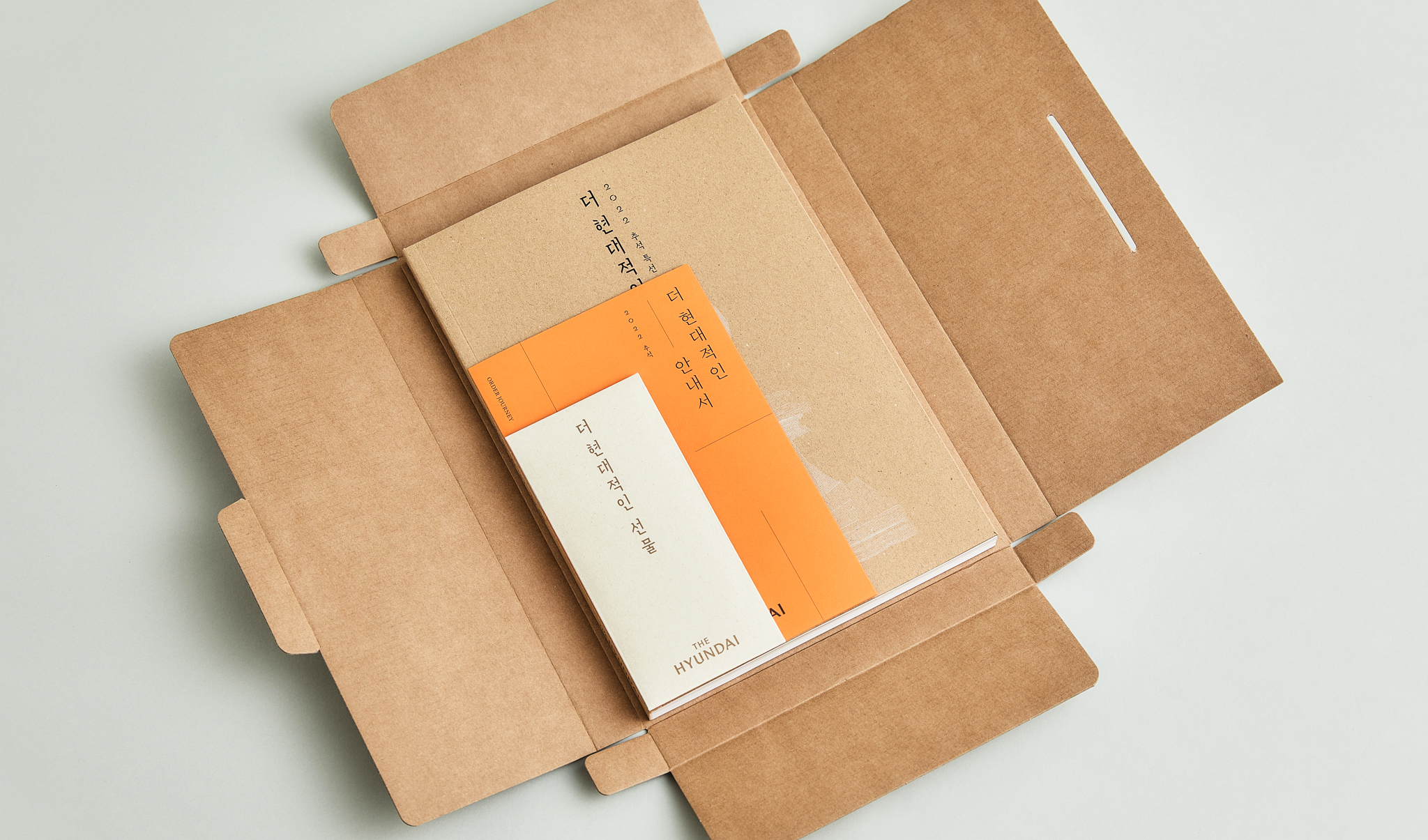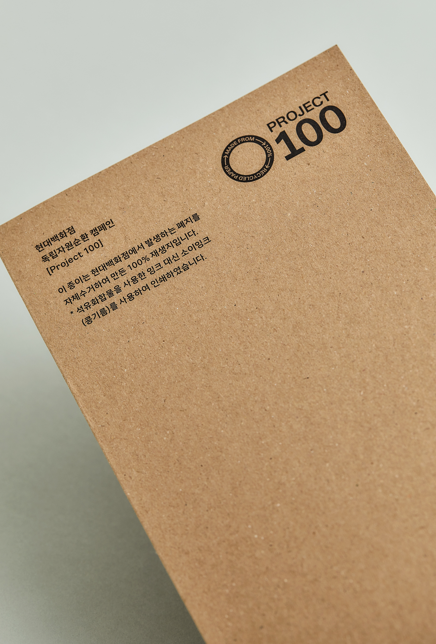 또한 최근 백화점의 ESG 경영과 맥락을 같이 하여 보다 친환경적인 만듦새를 고민했습니다. 표지로는 올해 현대백화점에서 나오는 폐지를 자체 수거하여 만든 재생지 '페이퍼100'을 썼습니다. 현재 일부 점에서 쇼핑백으로 쓰이고 있는 바로 그 종이입니다. 재생지 특유의 자연스러운 그레인은 물론, 쉽게 구겨지지 않으면서도 책을 촤르륵, 넘겨볼 때 탄력 있게 휘어지는 적절한 평량을 테스트해 책 읽는 맛을 더했습니다.