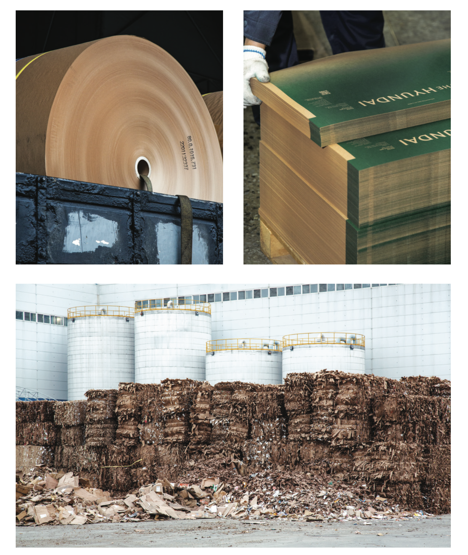 또한 최근 백화점의 ESG 경영과 맥락을 같이 하여 보다 친환경적인 만듦새를 고민했습니다. 표지로는 올해 현대백화점에서 나오는 폐지를 자체 수거하여 만든 재생지 '페이퍼100'을 썼습니다. 현재 일부 점에서 쇼핑백으로 쓰이고 있는 바로 그 종이입니다. 재생지 특유의 자연스러운 그레인은 물론, 쉽게 구겨지지 않으면서도 책을 촤르륵, 넘겨볼 때 탄력 있게 휘어지는 적절한 평량을 테스트해 책 읽는 맛을 더했습니다.
