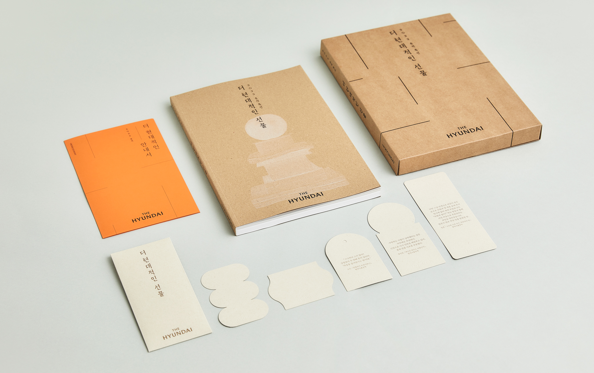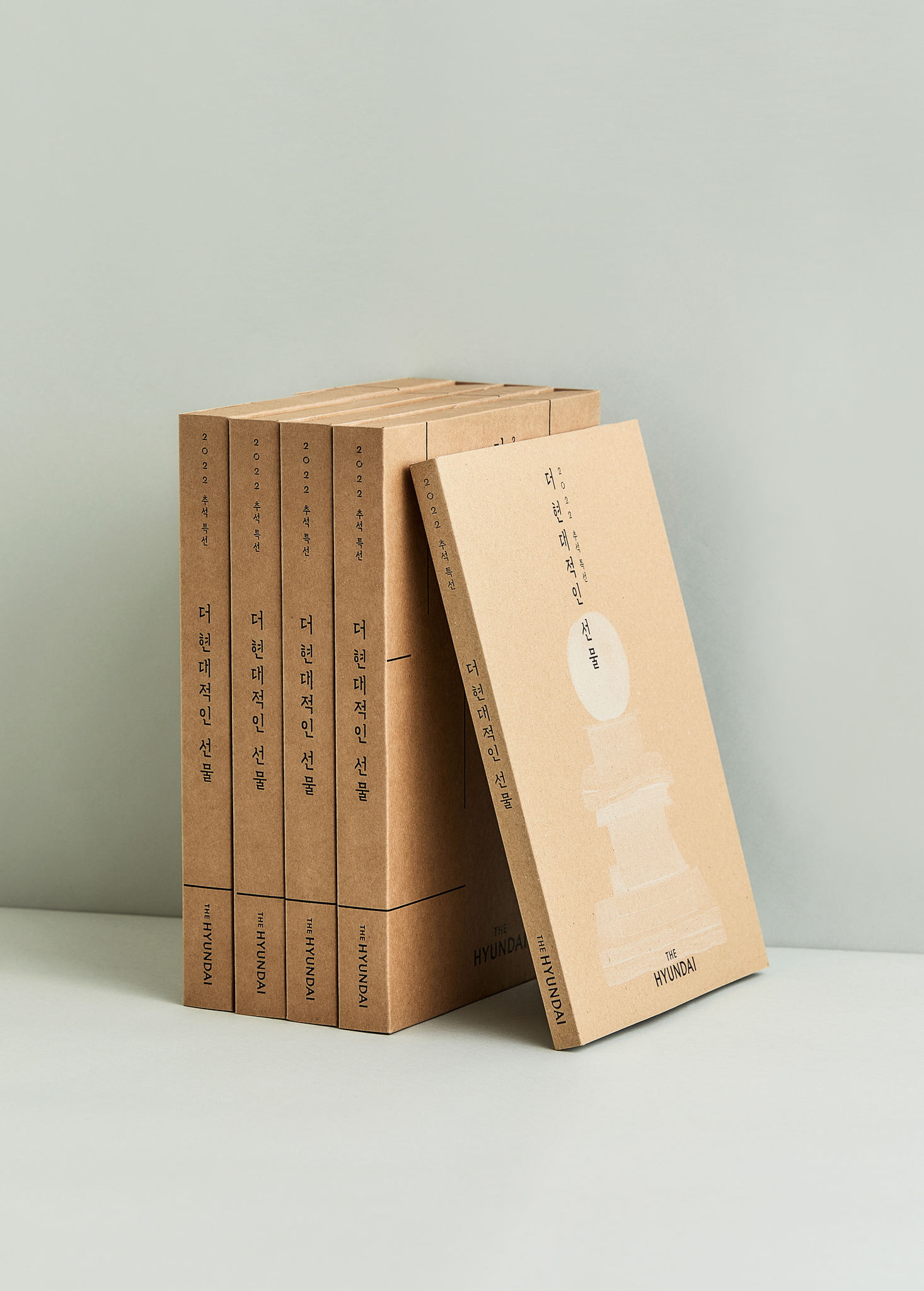 올해 선물집은 더욱 매끄러운 선물 경험을 선사하기 위해 본권, 안내서, 책갈피, 박스 패키지로 구성했습니다. 본권은 현대백화점의 선물이 만들어지는 과정부터 정육과 청과, 라이프스타일 제품군에 이르는 선물, 추석 선물에 관한 볼거리와 읽을거리를 담았습니다. 안내서는 바이어가 직접 정리한 Q&A를 수록해 주문 과정을 돕습니다. 책갈피는 많은 선물 중 원하는 선물을 표시해 두게 되는 선물집의 사용자 경험을 더욱 풍성하게 합니다. 한국의 문학가들이 현대식품관의 원물을 주제로 창작한 <현대식품문학>에서 추석과 관련된 구절을 새겨 의미를 더했습니다.