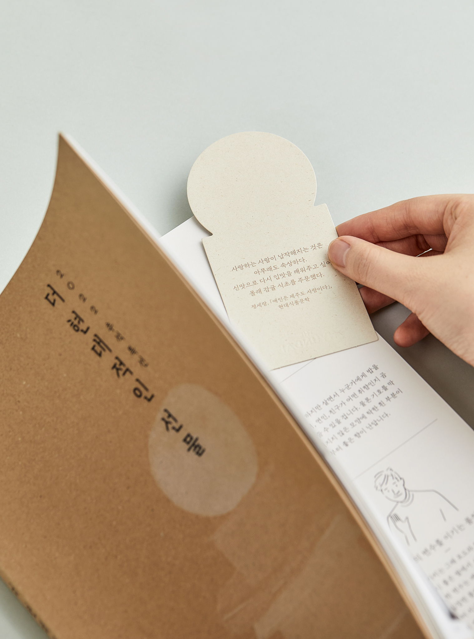 책갈피는 나무를 베지 않고 사탕수수만으로 만든 '얼스팩' 지종으로 만들었습니다. 페이퍼100과 잘 어울리는 은은한 미색이 <현대식품문학> 시구를 품은 모양새가 따뜻합니다.