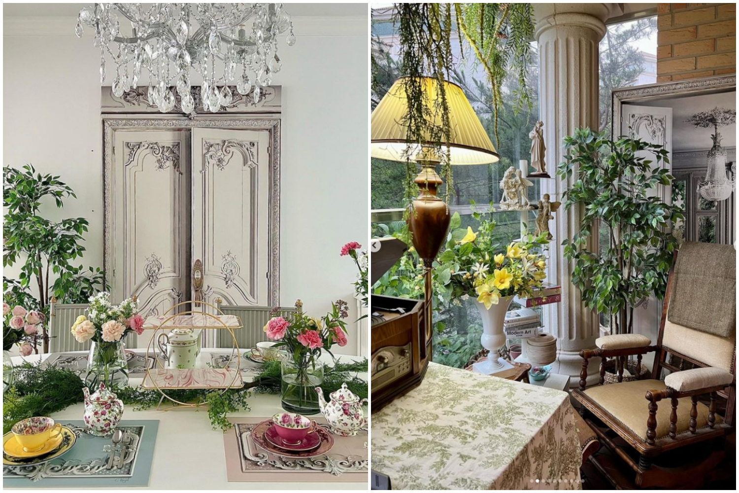 "가구들의 톤과 무드를 맞추는 것이 중요한 것 같아요. 저는 취향에 맞는 프렌치 앤티크 가구를 구입하면 필요에 따라 리폼을 하기도 해요. 새로 온 소품이나 가구가 기존의 가구들과 어떻게 합을 이룰지 머릿속으로 상상을 많이 하죠. 고민이 끝나면 전체적인 톤을 정해서 리폼을 전문으로 작업하는 작가님께 의뢰를 드려요. 그렇게 기존 공간에 중심이 되어준 가구나 오브제에 잘 어울리게 스며들게 해요. 그리고 프렌치 인테리어에서 절대 빼먹지 말아야 할 것은 바로 내추럴한 꽃과 식물이 아닐까 해요. 꽃 그 자체가 가진 생기는 말할 것도 없고 아름다운 색감과 향기로 다채로운 인테리어 효과를 선사하죠.