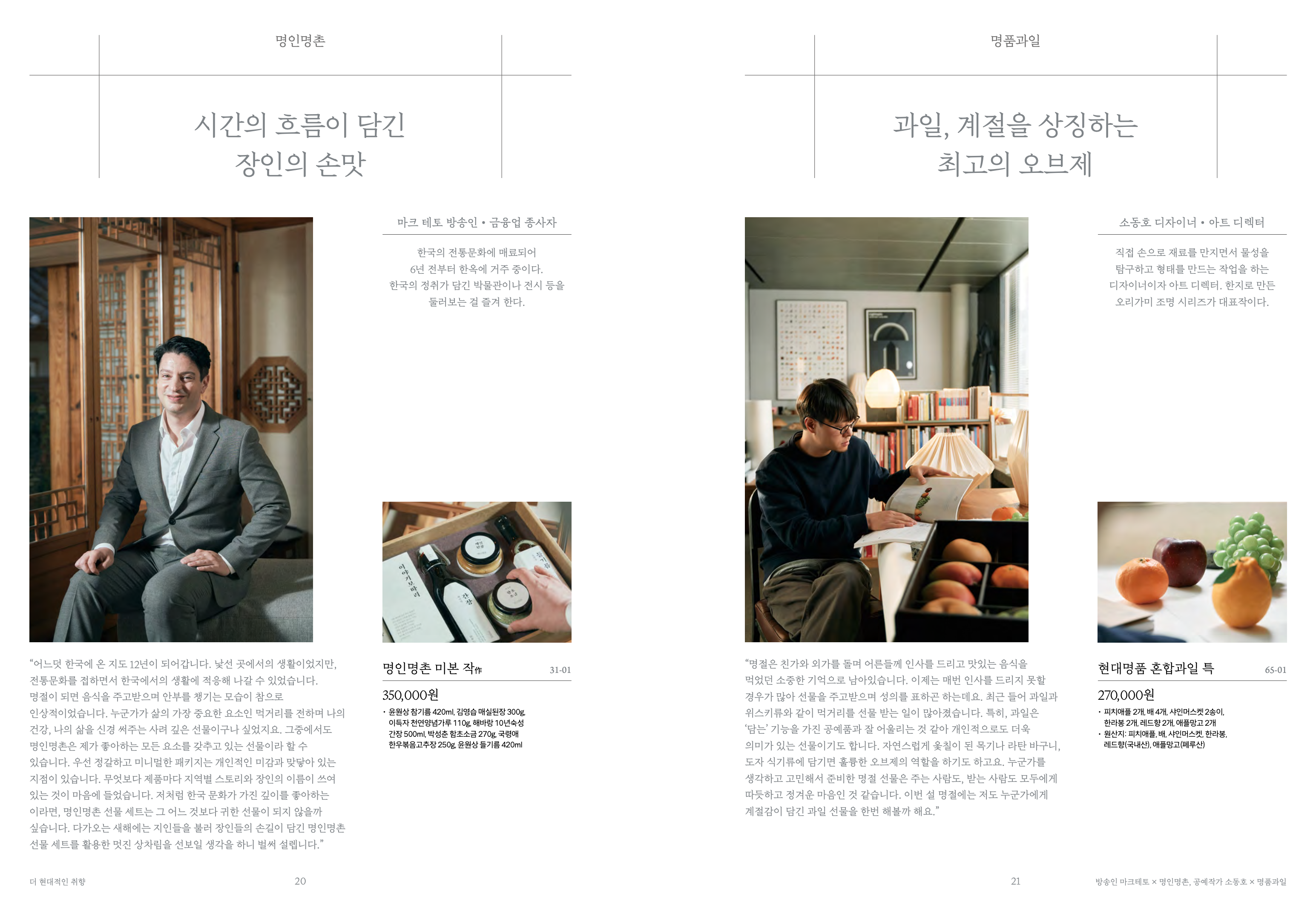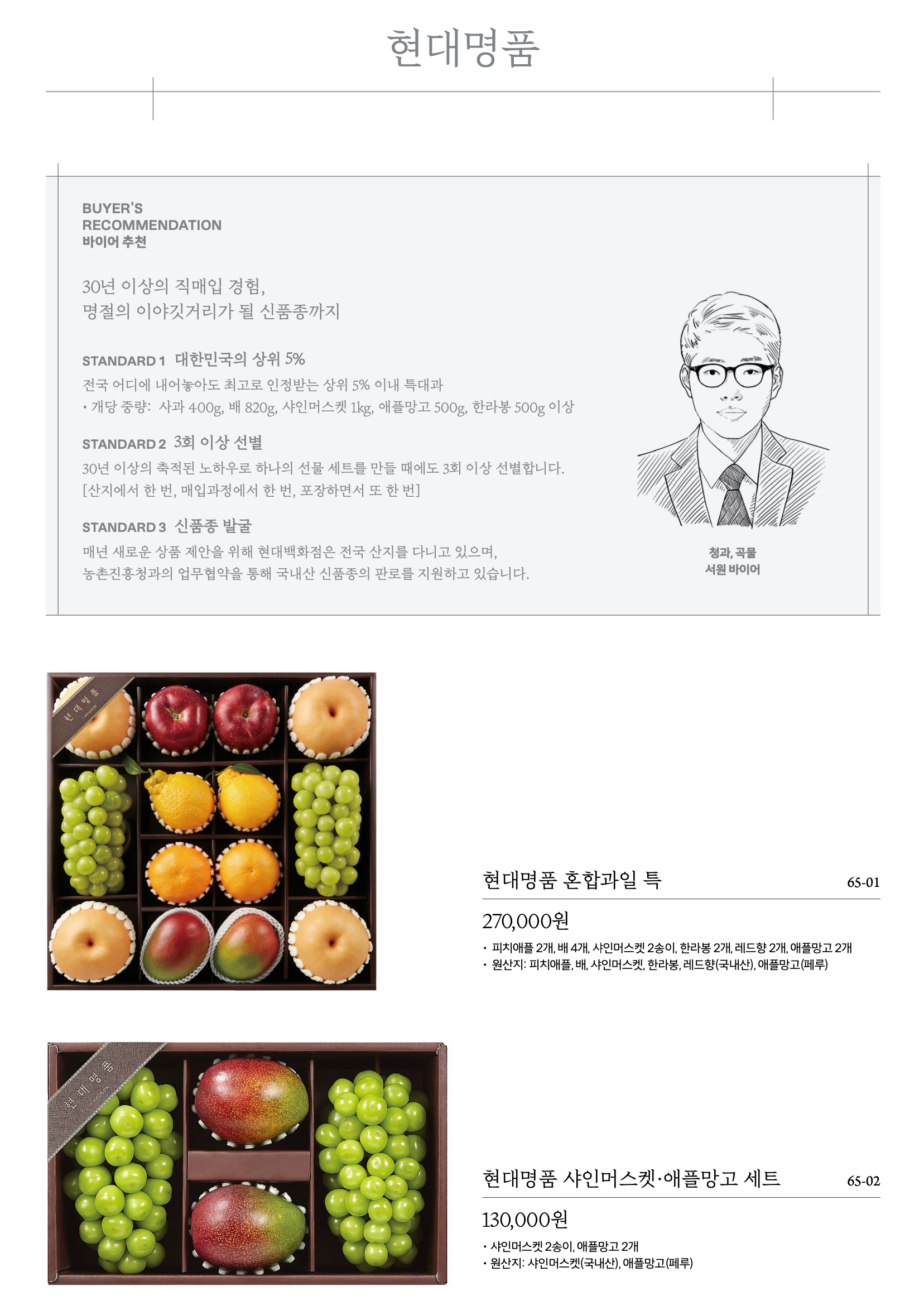 한우, 청과, 수산, 곶감에 이르기까지 각 품종의 품질을 든든하게 지켜 온 바이어들의 살아 있는 현장 이야기가 담겼습니다. 언제나 고개를 끄덕이게 하는 최상의 퀄리티 뒤에 숨은 노력의 이야기는 받으시는 분에게도 고스란히 가 닿을 겁니다.