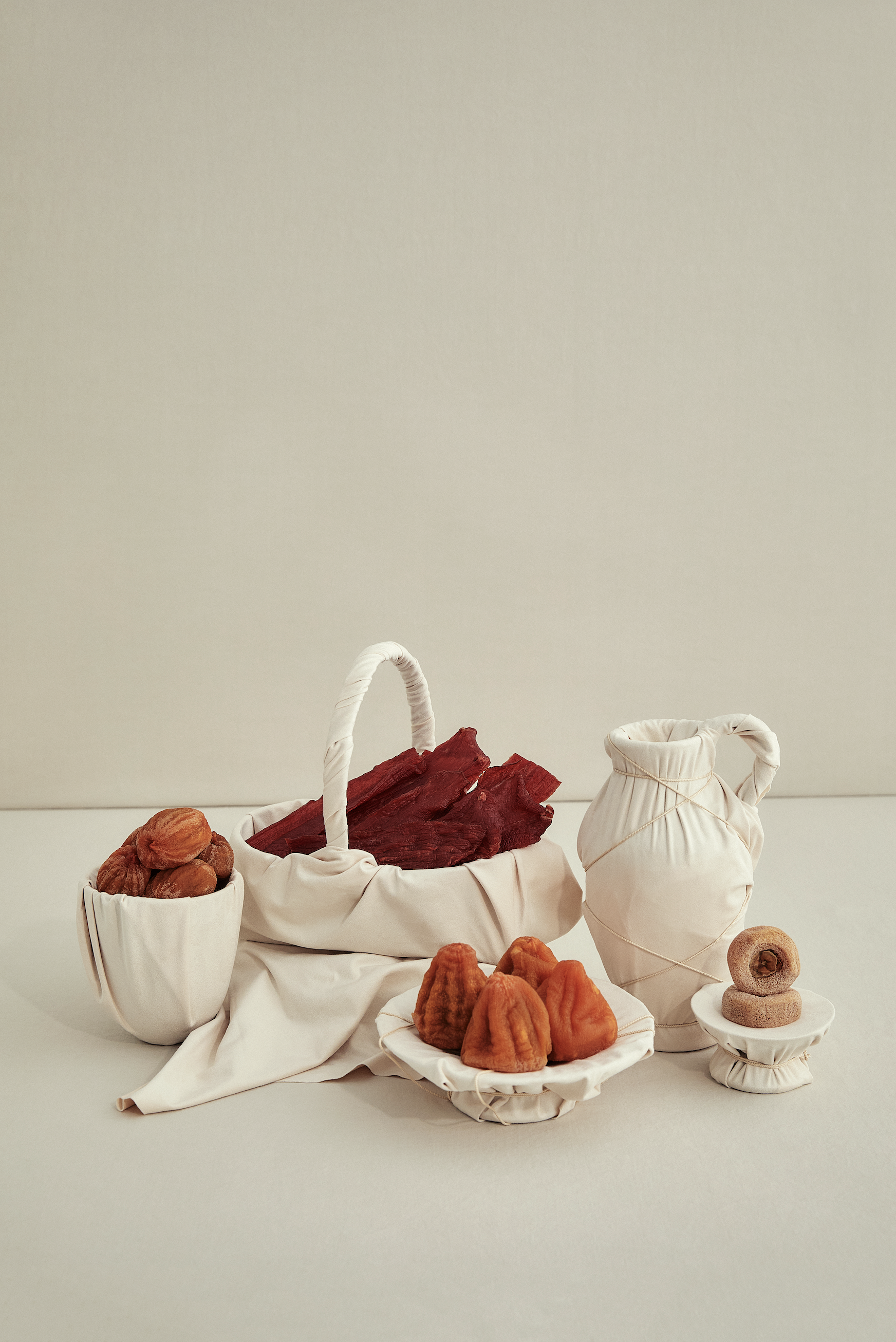 올해의 선물 화보 역시 매듭에서 착안해 단단하게 여민 오브제들 사이로 원물의 탐스러운 모습을 포착했습니다.