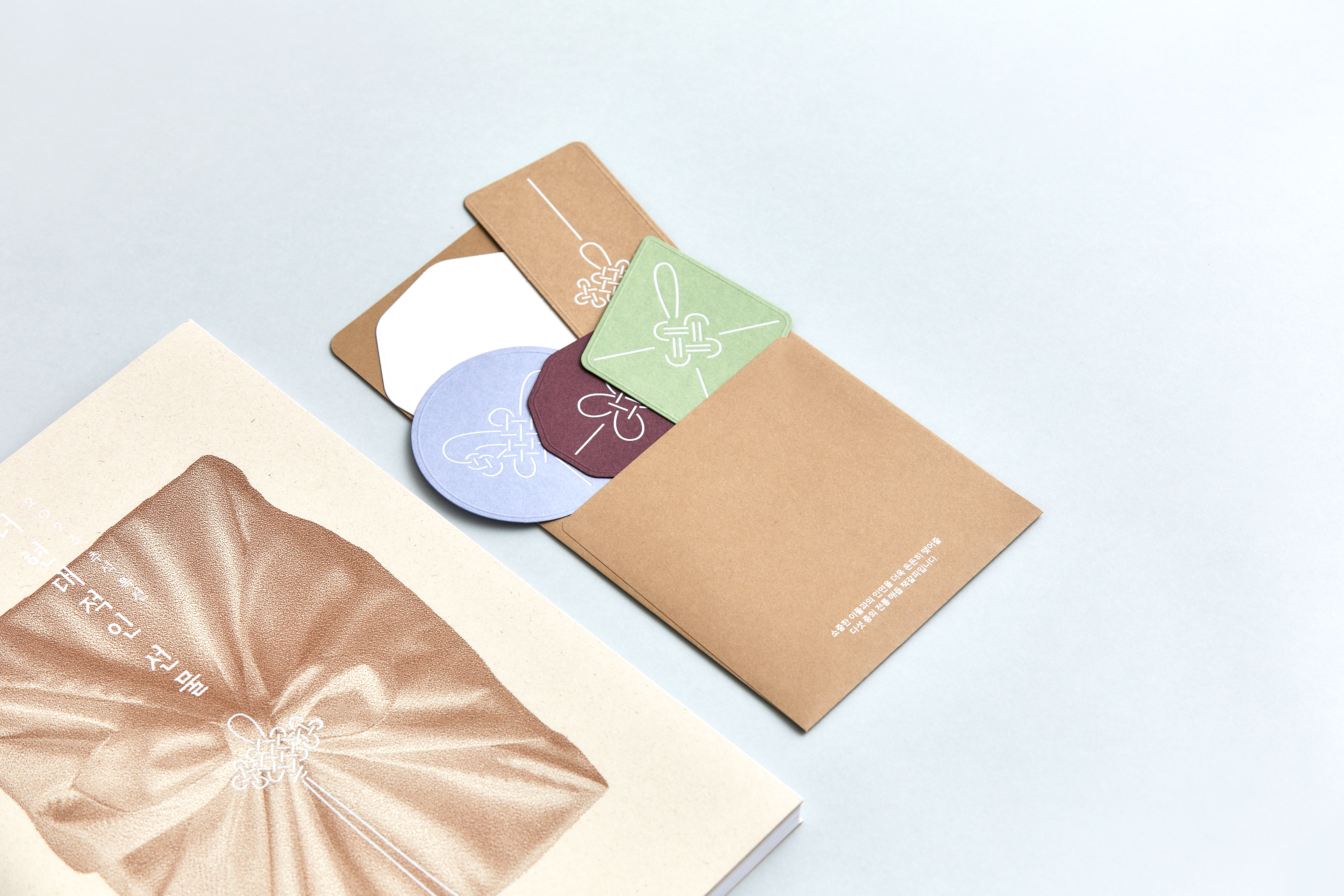 사탕수수 100% 성분의 친환경종이 슈가릿으로 제작한 표지에는 선물을 품은 채 정갈하게 묶인 보자기와 '어려움을 극복한다'는 의미를 품은 전통 매듭, 병아리 매듭을 새겼습니다.