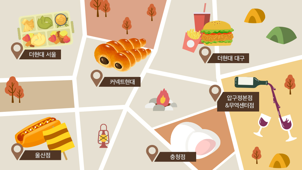 지금까지 전국의 캠핑장과 인근의 현대백화점, 캠핑 가는 길에 이용하면 좋을 식음료 매장과 서비스를 소개했습니다. 이 외에도 가평의 명물 ‘유일닭강정’ (중동점 ・ 현대 프리미엄아울렛 SPACE 1), 마곡을 점령한 베이글 맛집 ‘베이글리스트’ (더현대 서울 ・ 압구정본점 ・ 목동점 ・ 중동점), 대만의 버블티 전문 브랜드 ‘드링크스토어’ (무역센터점 ・ 미아점 ・ 중동점 ・ 킨텍스점 ・ 판교점 ・ 더현대 대구 ・ 울산점 ・ 커넥트현대 ・ 현대프리미엄아울렛 송도점) 등 다양한 식음료 매장을 전국 현대백화점에서 만나볼 수 있어요. 캠핑의 완성은 음식이라는 사실을 기억하며, 캠핑장으로 향하는 길에 백화점 들러 장 보는 거 잊지 마세요!