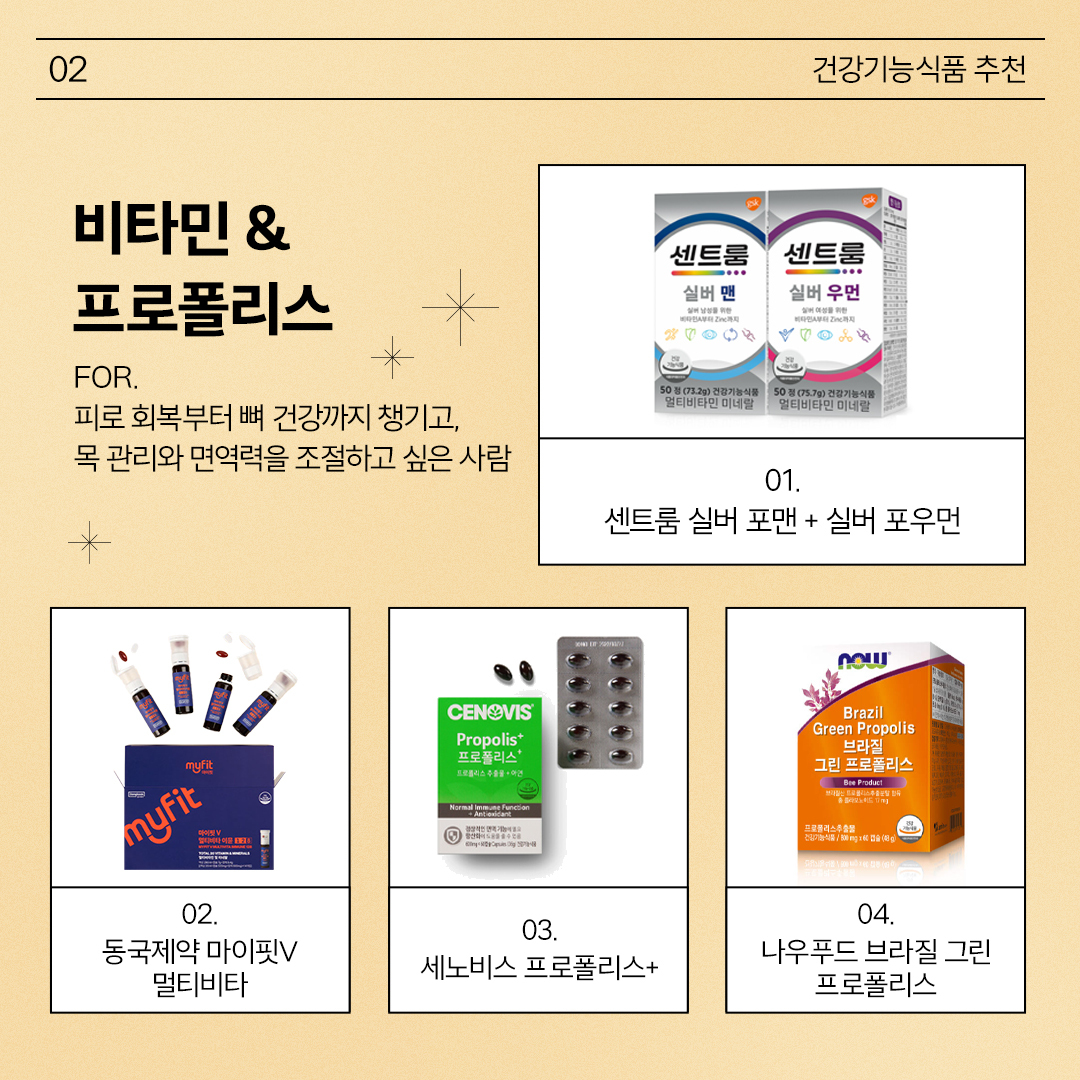 환절기 연례행사 같은 감기 예방에 필수적인 비타민. 여기에 ‘천연 항생제’ 프로폴리스까지 더해지면 두려울 게 없죠. 전자의 경우 그 종류가 다양한 만큼 내 몸에 필요한 성분과 일일 권장 섭취량을, 후자의 경우 항산화에 도움을 주는 플라보노이드 함량을 확인해야 더욱 효과를 높일 수 있어요. 현재 식약처에서 권장하는 플라보노이드의 일일섭취량은 20-40mg입니다.