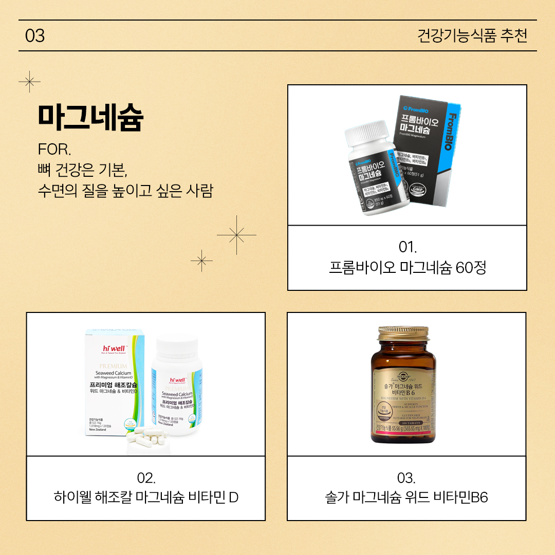 면역력을 높이는 방법 중 하나는 질 좋은 수면을 취하는 것. 이때 필요한 것이 바로 마그네슘입니다. 골격과 치아를 구성하는 것 외에도 신경흥분의 전달과 근육의 이완 및 수축 기능에 관여해 숙면을 돕기 때문이죠. 환절기 편두통이나 근육통에도 도움이 되는 마그네슘, 식약처에서는 94.5-250mg을 일일섭취량으로 권장하고 있어요.