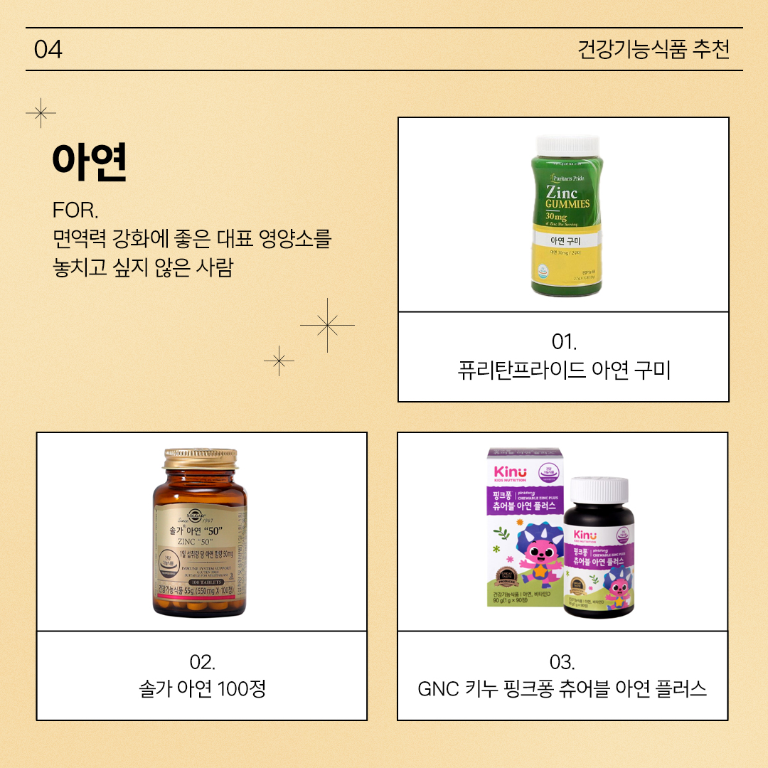 우리 몸에 아주 소량 필요하지만 정상적인 면역기능과 세포분열 등 중요한 역할을 담당하는 아연. 음식을 통한 체내 흡수율은 낮은 편이라 건강기능식품으로 함께 챙겨야 하는 영양소입니다. 식약처에서 권장하는 아연의 일일섭취량은 2.55~12mg. 결핍 예방을 위해 남성은 하루 10mg, 여성은 하루 8mg 섭취하는 것도 좋아요.