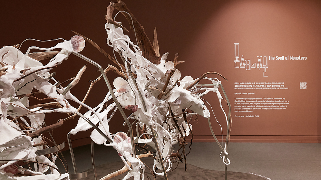 바로 옆 MOKA Lab에서는 이탈리아 아티스트 카밀라 알베르티의 <몬스터의 주문>이 이어집니다. 전시장을 채운 뾰족하고 기묘한 형태의 괴물들은 사실 버려진 재료에 숨을 불어넣은 조각 작품. 마른 나뭇가지에 점토며 폐플라스틱들이 덧씌워진 모습을 보고 있자면 ‘이 괴물을 만든 진짜 주인공은 누구일까?’ 하는 물음표가 생겨요. 더이상 환경 문제를 외면할 수 없는 요즘, 작품 앞에서 이야기 나누며 생각을 확장해보아도 좋겠네요.