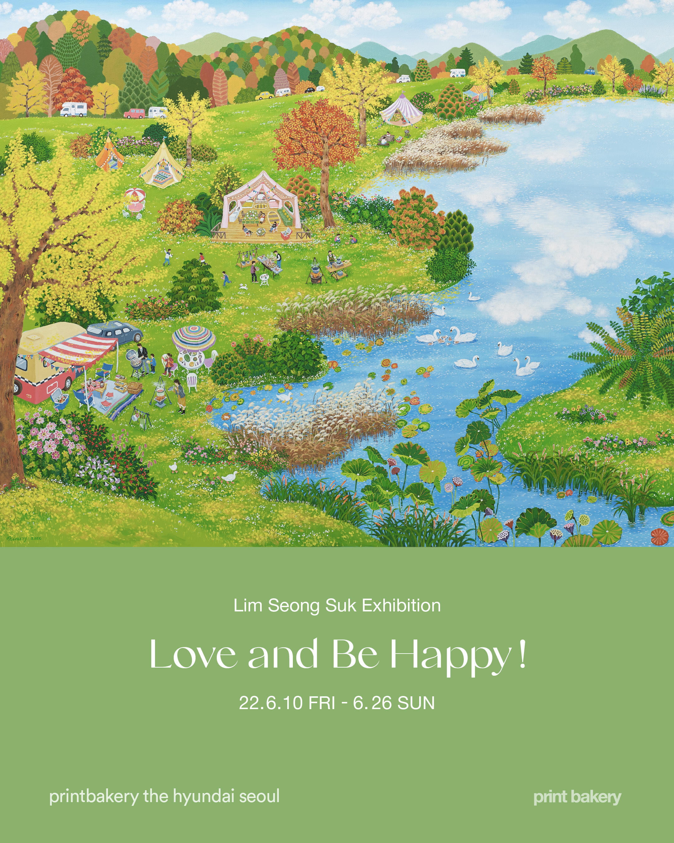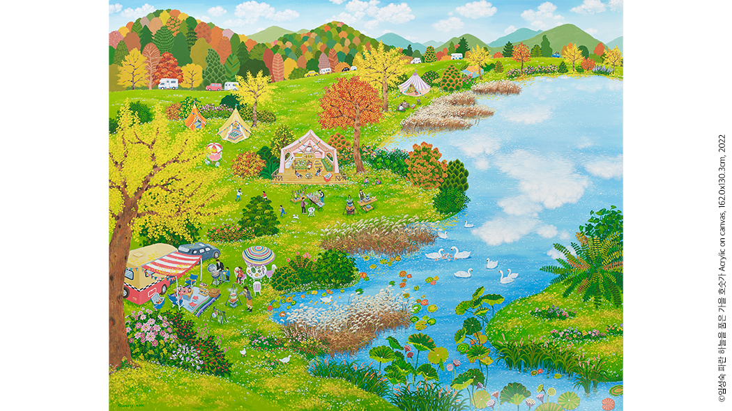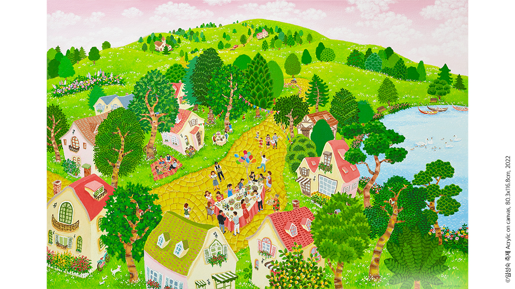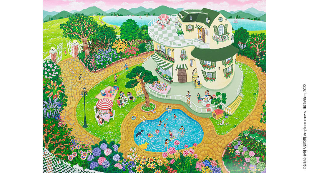 6월 10일부터 열린 <Love And Be Happy!>는 임성숙 작가의 개인전으로 총 9점의 원화를 선보인다. 홍익대학교 서양화과를 졸업하고 그간 10여 차례가 넘는 개인전과 30회 이상의 아트 페어 및 그룹전을 통해 탄탄한 작품세계를 일궈온 작가는 이번에도 남다른 작품으로 관객과 만난다. <Love And Be Happy!>라는 제목에서 엿볼 수 있듯 총천연색으로 가득한 작품은 하나같이 경쾌하고 환상적이며, 환하고 따듯하다. 봄과 여름, 가을과 겨울 그리고 태양이 작열하는 낮과 어스름이 내려앉은 밤의 풍경이 동화처럼 펼쳐진다. 작품 곳곳에서는 자연에 대한 찬미를 엿볼 수 있는데 작가는 “새삼 각기 다른 찬란한 계절의 다채로움에 감탄한다. 감성을 자아내는 세상의 아름다움과 풍요로움으로 고개가 숙여진다.”라며 짧은 소회를 전하기도 했다. 그래서일까, 꽃과 나무, 하늘과 맞닿은 물결, 싱그러운 연둣빛을 보고 있노라면 덩달아 마음이 평온해진다.