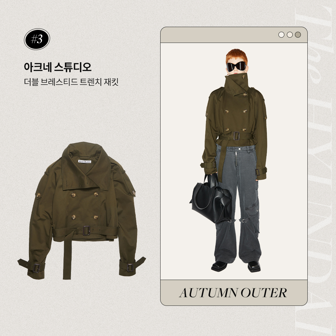 코튼 소재의 더블 브레스티드 트렌치 재킷도 한 번 보고 가세요. 짧은 기장과 함께 톤 다운된 밀리터리 그린 컬러가 만들어 내는 힙한 느낌이 눈길을 사로잡는데요. 평소 긴 기장의 트렌치코트가 지루하게 느껴졌다면, 릴렉스 핏에 짧은 기장의 이 아이템을 선택해 보는 것도 좋겠네요. 버튼 여밈이나 밑단, 소매에 더해진 벨트 디테일도 포인트가 되어주며 신선한 스타일링을 연출하기 좋습니다.