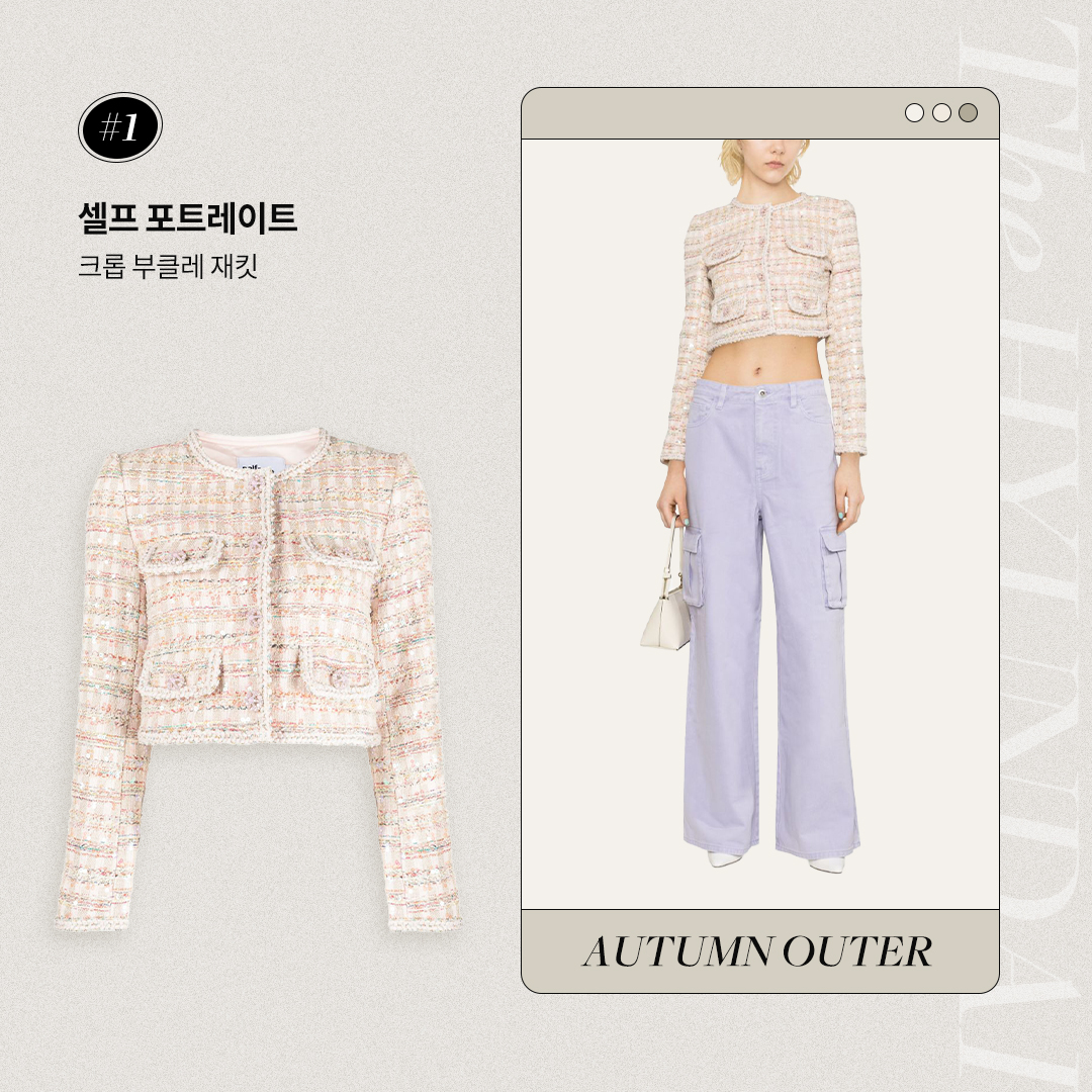 셀프 포트레이트는 레이스 등의 패브릭을 활용한 섬세한 디자인과 미니멀리즘 감성이 더해져 고급스러운 제품들을 선보이는 여성 컨템포러리 브랜드인데요. 이미 기본 아우터가 있다면 셀프 포트레이트의 연핑크 라운드 넥 부클레 재킷은 어떨까요? 시퀸 장식으로 경쾌한 무드가 더해지는 것은 물론, 크롭 디자인으로 한층 더 트렌디한 룩을 완성할 수 있습니다. 동일하게 짧은 기장의 크롭 이너와 함께 허리 라인을 강조하며 와이드한 팬츠를 매치한다면 더욱 멋스러운 스타일링이 가능합니다.
