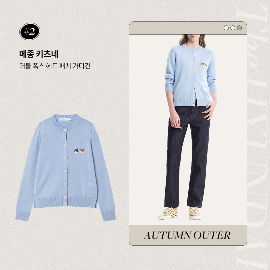 사랑스러운 무드의 아우터를 찾고 있다면 메종 키츠네의 아이템을 추천합니다. 메종 키츠네 브랜드의 시그니처 패턴인 더블 폭스 헤드 패치가 돋보이는 이 카디건은 다양한 방식으로 활용할 수 있어 실용적인데요. 가을에는 가볍게 아우터로 걸치다가 겨울에는 이너로 활용하기에 그만이죠. 울 소재 니트로 제작해 부드러우며, 덕분에 불편함 없이 편하게 착용할 수 있습니다.