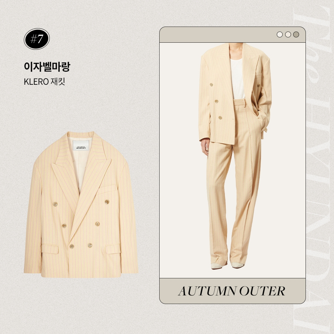 가을이라고 해서 꼭 어두운 컬러의 아우터를 선택하란 법은 없습니다. 이자벨마랑의 라이트 옐로우 컬러 재킷도 고려해 보세요. 핑크 컬러의 스트라이프가 잔잔한 포인트로 들어가 있는 매력적인 아이템입니다. 버튼을 잠그거나 여는 것에 따라 다른 느낌으로 연출할 수 있고, 이너로 셔츠나 카디건의 톤을 맞춰서 올드머니룩을 시도해 봐도 좋겠네요.