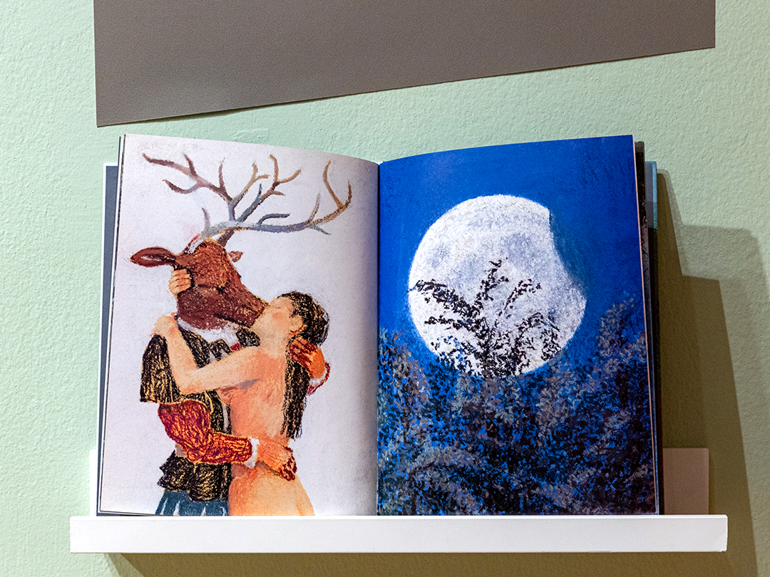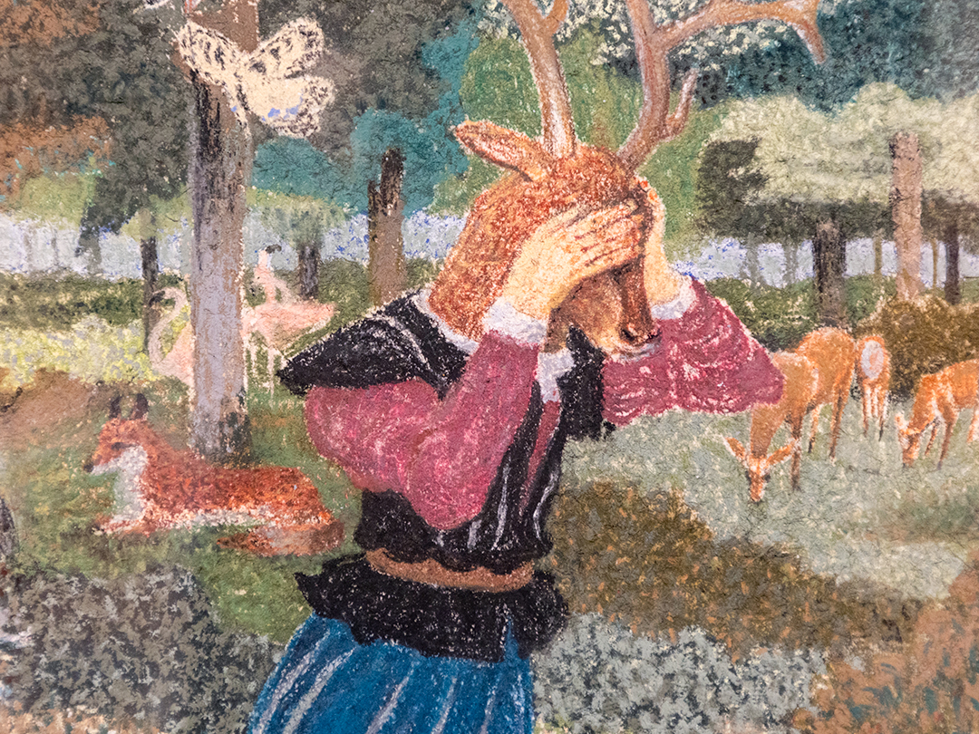 그리스 신화 속 사냥꾼 악타이온도 등장합니다. 원작에서 사슴을 쫓던 악타이온은 아르테미스 여신의 분노를 사 오히려 사슴으로 변해버리는데, 이번에는 목숨을 잃는 대신 여신과 사랑에 빠집니다. 파스텔 특유의 몽글몽글한 질감과 점점이 찍힌 기법이 시선을 사로잡아요.