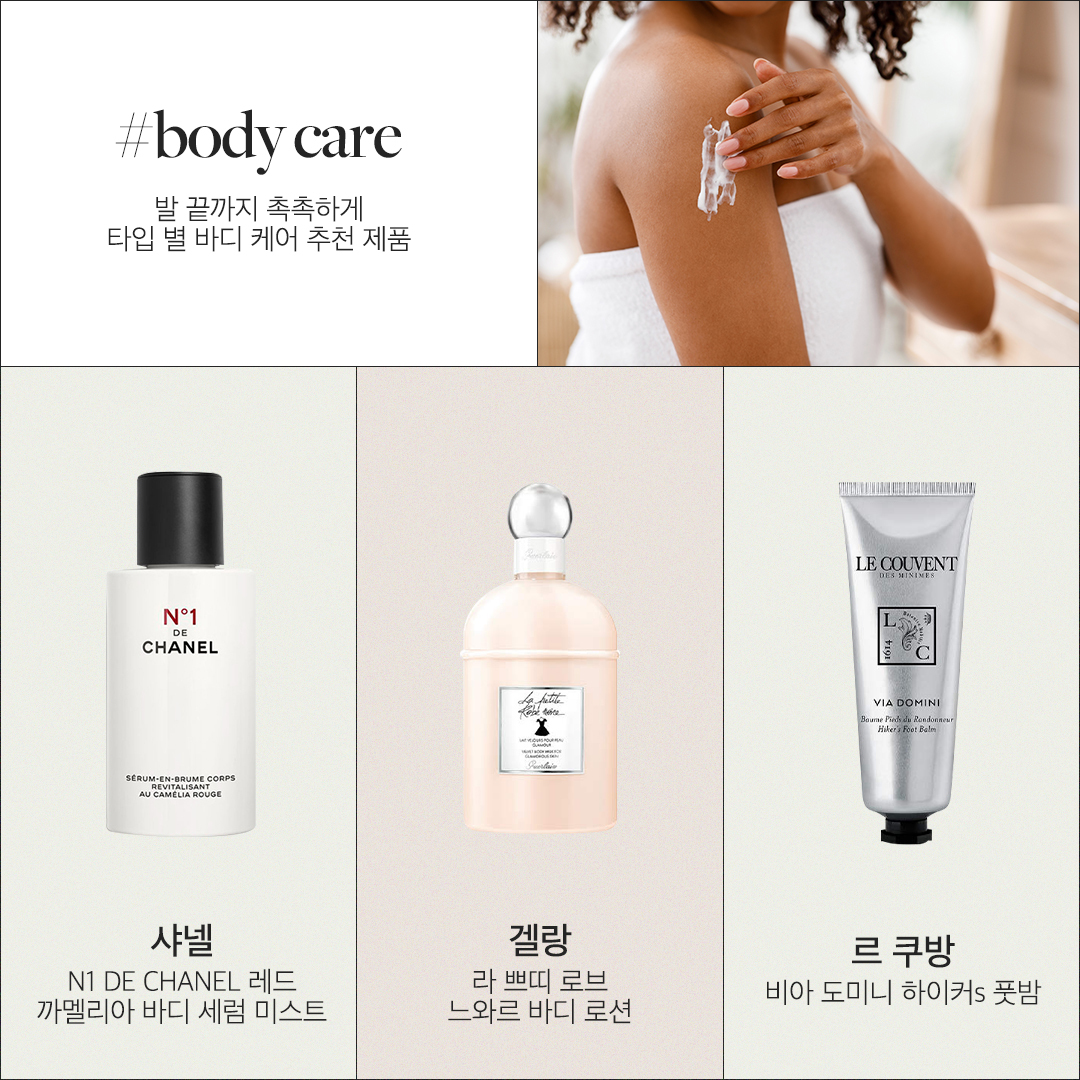 샤넬 ‘N1 DE CHANEL 레드 까멜리아 바디 세럼 미스트’ 강인한 생명력을 지닌 레드 까멜리아 추출물이 함유된 제품입니다. 포뮬러는 천연 유래 지수 93%로 이루어져 있으며, 41% 까멜리아 추출 성분을 함유하고 있죠. 가을이라 건조함이 눈에 띄는 몸에 가볍게 뿌리는 것만으로도 까멜리아의 탁월한 에너지로 생기와 탄력을 더할 수 있습니다. 바디 로션을 답답하고 무겁게 느끼시는 분들께 추천해요. 제품 바로가기