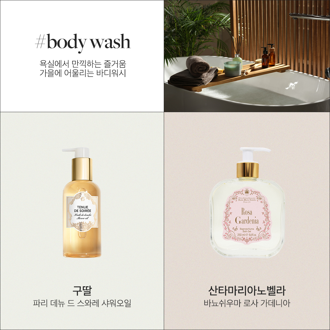 구딸 파리 ‘데뉴 드 스와레 샤워오일’ 건성 피부로 추워진 날씨가 걱정이라면 바디워시부터 샤워오일로 바꿔보세요. 건조하기 쉬운 가을 피부를 샤워 중에도 케어 할 수 있을거예요. 핑크 페퍼, 아이리스, 패출리 노트가 은은하고 매혹적인 향을 남기는 한편, 피부에 부드러운 베일을 남기며 샤워 후에도 건조함 없이 촉촉함을 선사합니다. 제품 바로가기