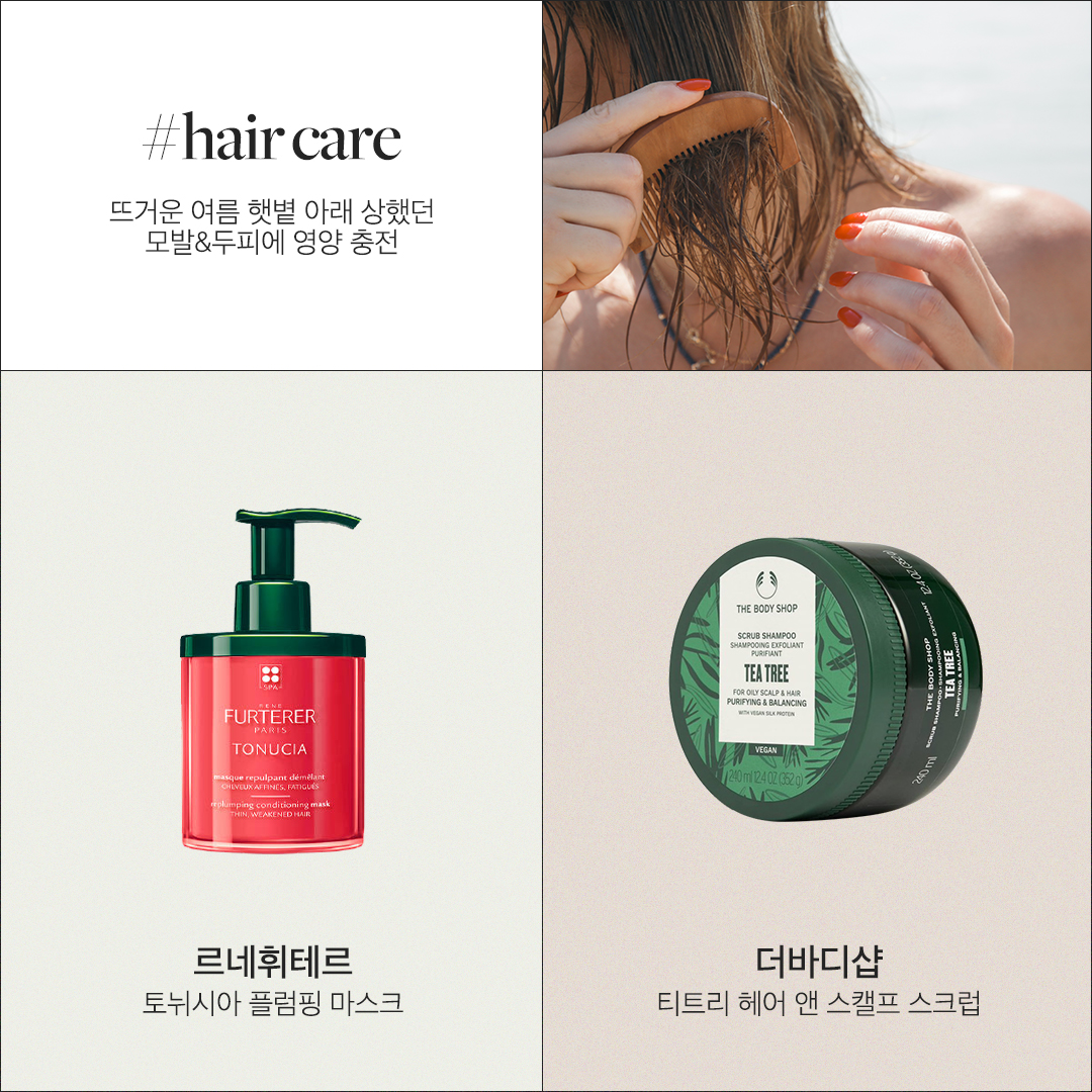 더바디샵 ‘티트리 헤어 앤 스캘프 스크럽’ 아직도 스크럽을 얼굴, 바디 피부에만 사용한다고 생각을 한다면 오산이에요! 두피 역시 스크럽을 통해서 모발의 활기를 더할 수 있는데요. 정화 성분으로 유명한 티트리 잎 오일, 쿨링과 리프레싱 특성이 있는 멘톨 성분을 비롯해 비건 실크 프로틴까지 함유되어 손상된 모발을 보호하는 데 도움을 준답니다. 기름진 두피와 모발을 깔끔하게 하면서 각질 제거는 물론 모발에 생기를 더할 수 있습니다. 제품 바로가기