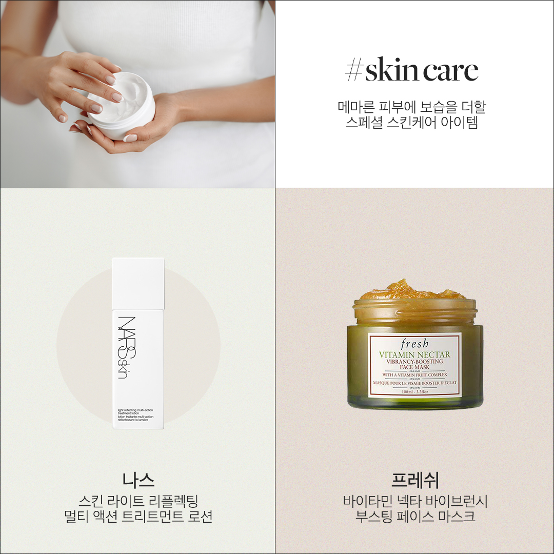 나스 ‘스킨 라이트 리플렉팅 멀티 액션 트리트먼트 로션’ 가을의 스킨케어는 수분 충전이 중요하죠. 나스만의 진보된 기술로 탁월한 보습감과 생기 있는 피부를 만들어 줄 제품입니다. 덕분에 건조한 공기 속에서도 화사하고 눈부신 피부를 완성할 수 있죠. 완성도 높은 피부 표현과 어느 각도에서나 빛나는 피부를 연출하는데 도움을 줍니다. 제품 바로가기