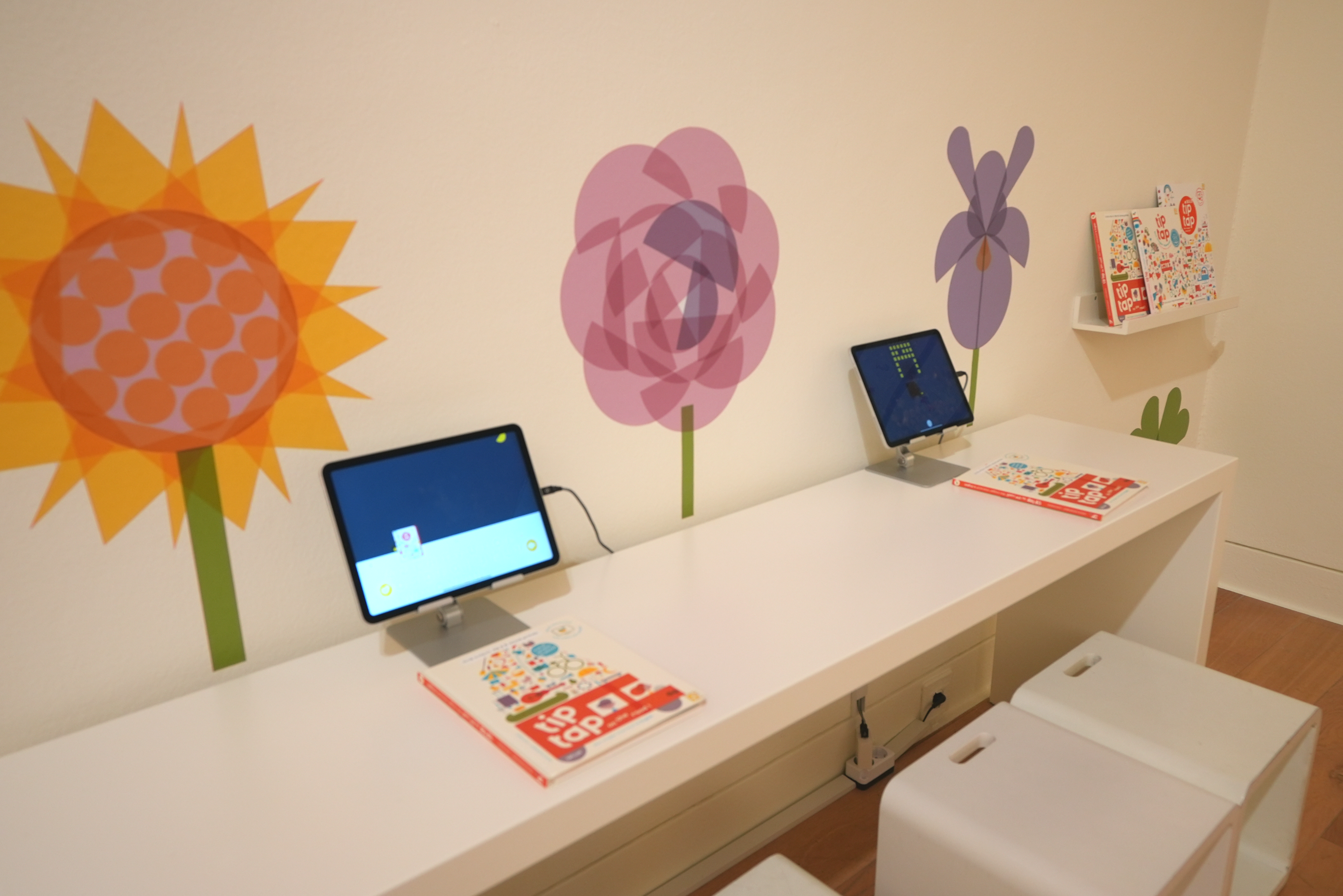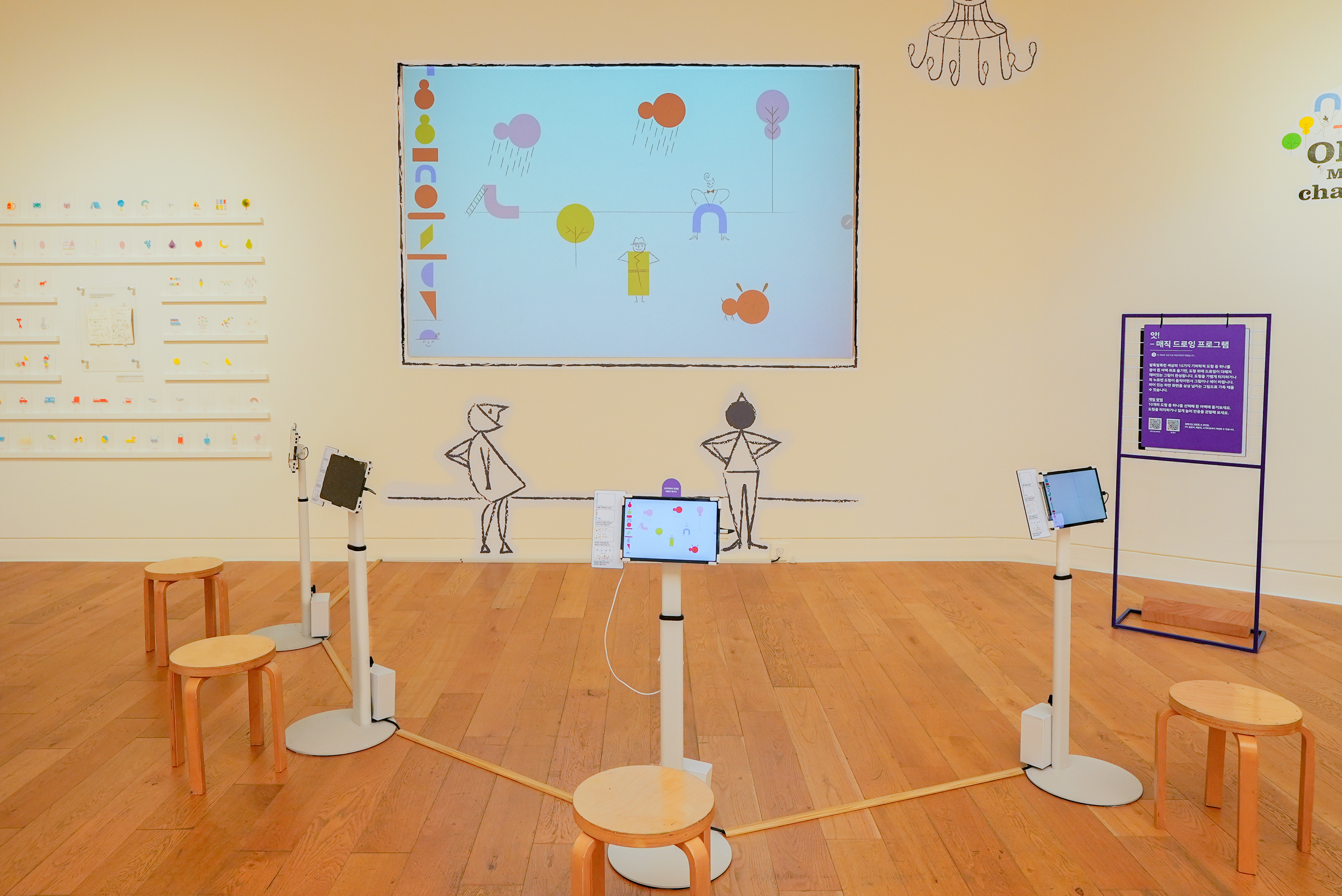 화면을 터치하면 도형이 춤추듯 움직이고, 빈 여백이 그림으로 채워지는 인터랙티브 드로잉 프로그램입니다. 아이는 이 프로그램에 푹 빠져서 한참을 그 자리에 서 있었습니다.