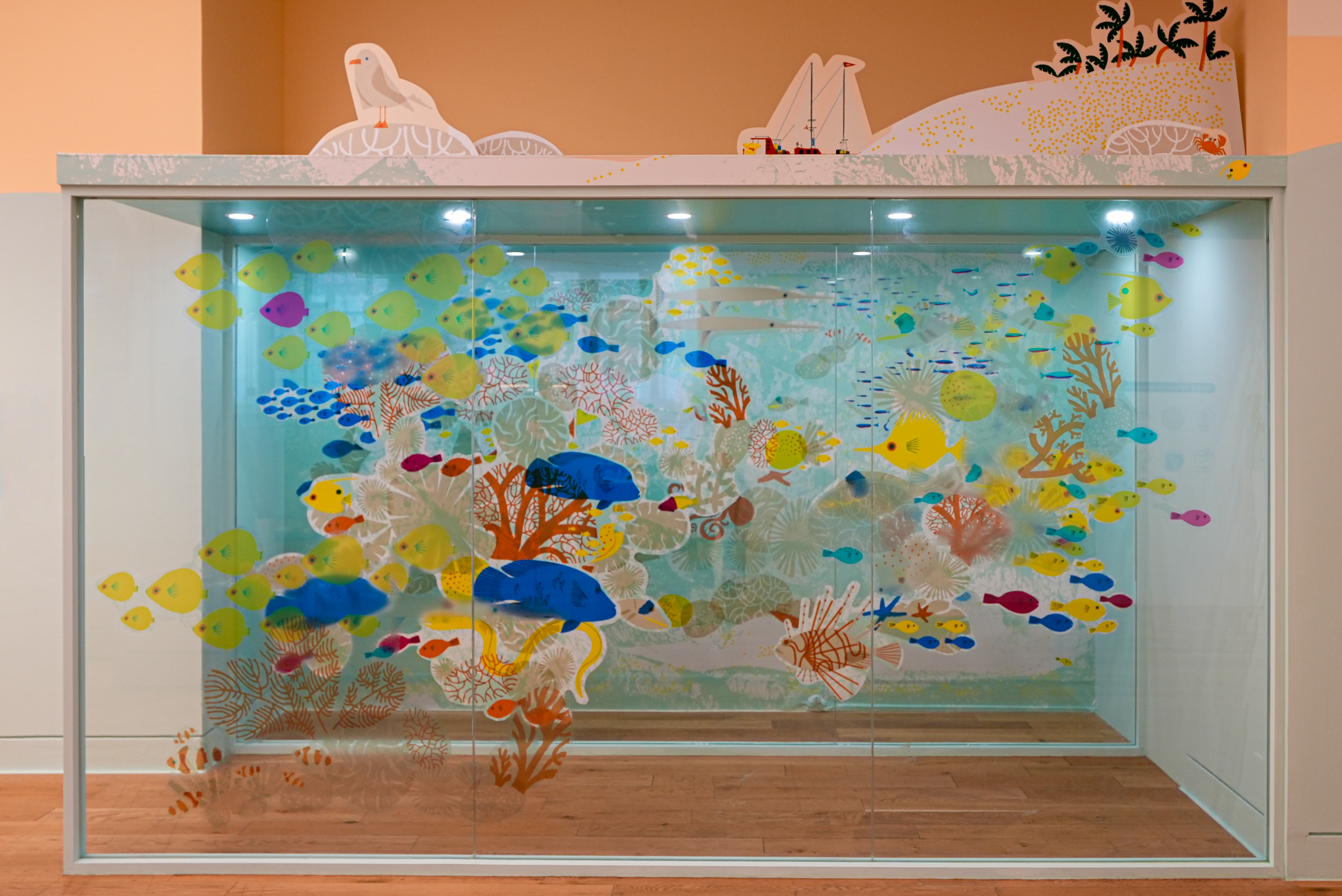 깊고 푸른 바다를 표현한 책. 파도, 물고기, 쓰레기 경고 표지까지, 종이가 품은 환경 메시지가 인상적이었습니다. 2017년 전시에서는 빙하 장면을 큰 구조물로 연출했는데, 이번 전시에서는 아름다운 라군 장면을 유리벽을 이용해 연출했습니다.