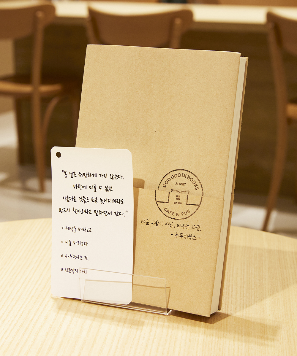 페이퍼 라운지에서는 두두디북스에서 직접 큐레이션한 책을 읽어볼 수 있는 공간인데요. 큐레이터가 직접 읽고 느낀 점을 적은 추천사가 함께 있어 한층 더 설레는 마음으로 즐길 수 있습니다. 또, 독서에 방해되지 않도록 조용한 커피머신을 사용하는 등 섬세한 배려가 돋보이는 장소랍니다.