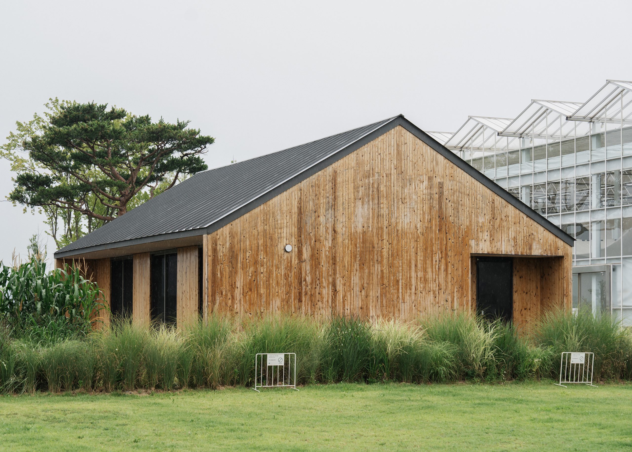 뤁스퀘어의 얼굴인 A동 웰컴센터에서 체크인을 하고, 1층으로 내려가 자연의 내음으로 가득한 실내 정원 스템 가든을 지나 푸르름이 펼쳐진 밖으로 나갔다. 주변 논밭과 어우러진 평지 위에 ‘교감하는 집’, ‘작은 집’, ‘이로운 집’ 3채가 나란히 자리 잡고 있다. 내가 묵을 곳은 일본 디자이너 하라 겐야原研哉, Kenya Hara가 디자인한 교감하는 집. 2022년에 열린 〈HOUSE VISION〉 전시를 위해 지은 이 집은 삼각형 박공지붕을 얹은 단순한 사각 구조로, 단단한 목재 패널로 건축했다. 문을 열고 들어가니 방이나 벽의 분리 없이 침실과 거실, 주방, 욕실이 한 공간에 공존한다. 무인양품의 무지하우스 프로젝트가 선보인 나무 가구들은 언뜻 단순해 보이지만 침대를 테이블과 벤치로 활용할 수 있으며, 소파 뒤에 작은 테이블이 딸린 신박한 사방 가구의 형태를 띠고 있다. 최소한을 추구하는 하라 겐야의 철학이 생활의 형태로 고스란히 담긴 평평한 집이다.