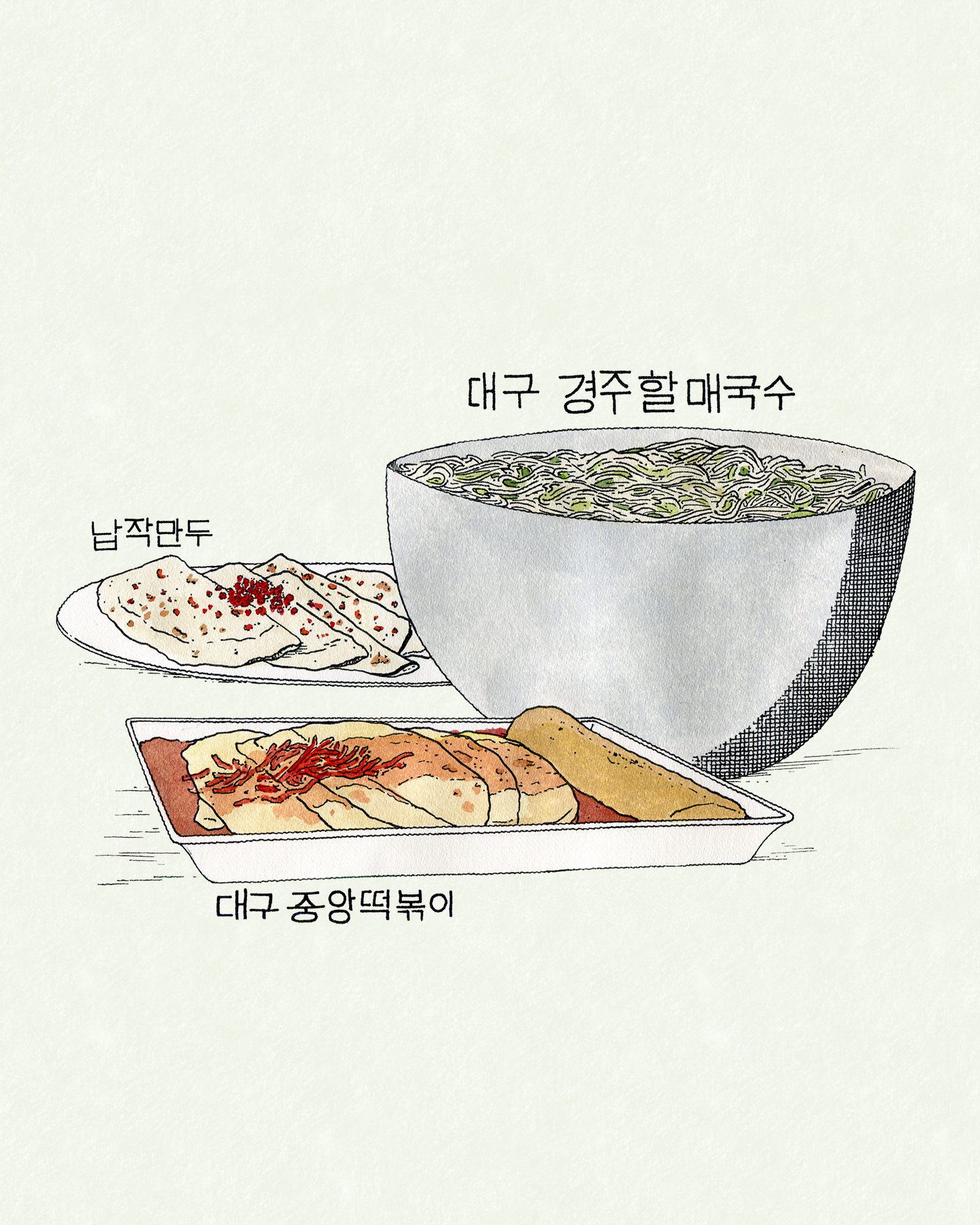 대구에서 분식과 국수 문화가 발달한 첫 번째 이유는 지리적 이점에 있다. 제분 산업이 발달한 부산과 가까워 밀가루를 가공하기에 유리한 것. 둘째는 국수를 만드는 데 최적인 습기 적고 고온 건조한 날씨다. 최근 들어 녹화 사업 등으로 완화되고 있지만, 1931년부터 1960년대 대구 평균기온은 25.9℃로 높았다. 1940년 8월 1일, 대구의 관측 기온은 당시 최고인 40℃를 기록하기도 했다. 셋째는 안동·영주를 중심으로 한 전통적 국수 문화다. 2015년 대구에는 국수 제조업체가 35곳 있었는데, 이는 제분업 중심지인 부산의 37곳, 인천의 34곳과 비교해볼 때 인구 대비 월등히 많은 수치다.