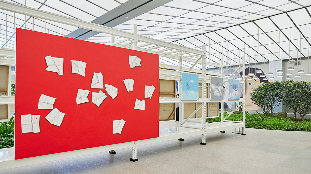 이번 <다이얼로그> 전시는 현대백화점 목동점 7층 글라스 하우스 공간 전체를 활용해 이뤄집니다. 전시가 단순히 작품을 보여주는 것을 넘어, 하나의 실천이 되어야 한다는 이대형 큐레이터의 지향점에 따라 폐기물을 최소화하고, 재활용이 가능한 자재로 공간을 구성했습니다. 야외 ‘하늘 정원’으로 이어지는 동선을 따라 그림과 가을의 정취를 동시에 즐길 수 있습니다.