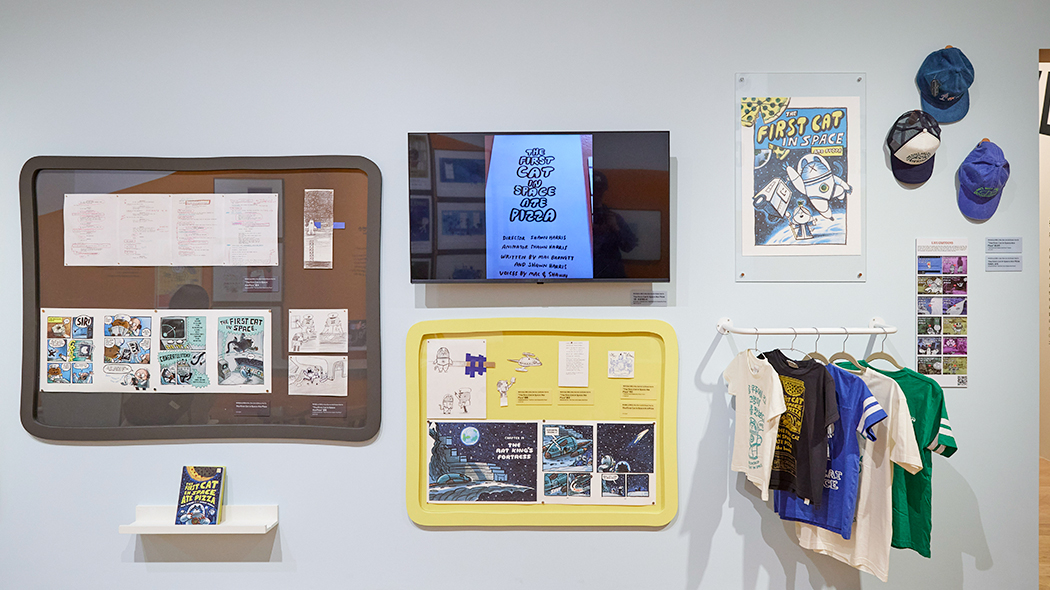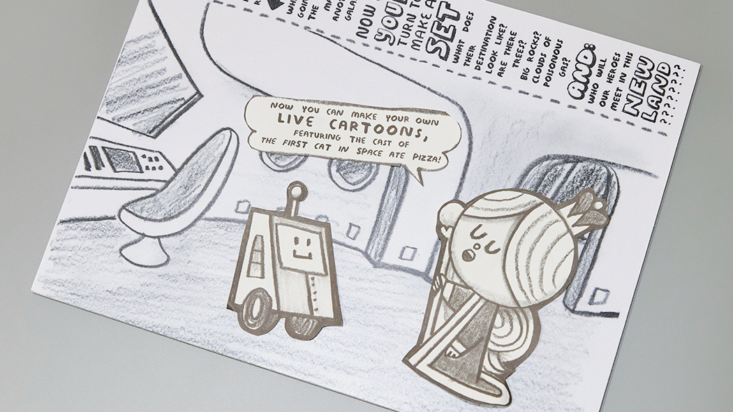 이번 전시에서는 작가의 ‘라이브 카툰쇼’를 나만의 방식으로 만들어 볼 수 있습니다. 전시실의 ‘DIY 라이브 카툰 키트’로 직접 자른 캐릭터를 배경 위에서 움직이고 대사를 하는 모습을 촬영해 카툰을 만들어 보세요.