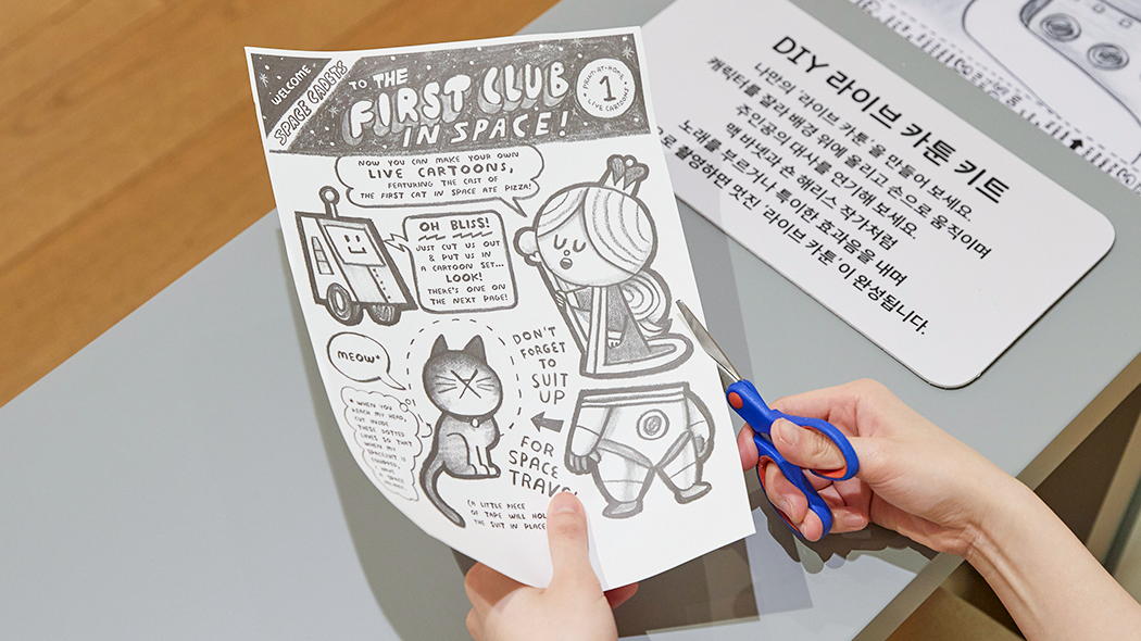 이번 전시에서는 작가의 ‘라이브 카툰쇼’를 나만의 방식으로 만들어 볼 수 있습니다. 전시실의 ‘DIY 라이브 카툰 키트’로 직접 자른 캐릭터를 배경 위에서 움직이고 대사를 하는 모습을 촬영해 카툰을 만들어 보세요.