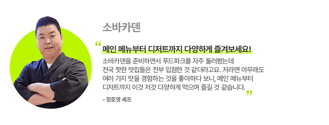 소바카덴은 일식을 전문으로 하는 정호영 셰프가 그동안의 쌓아온 노하우로 운영하고 있어요. 메밀 함량을 80%까지 높여 메밀 특유의 향과 맛을 온전히 느낄 수 있는 장인 정신이 돋보입니다.