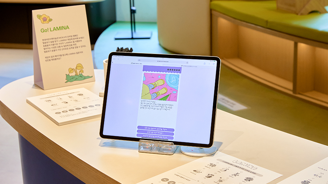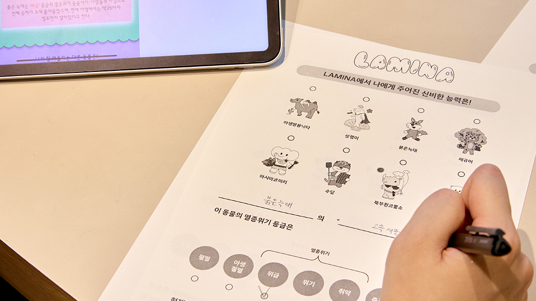 게이트를 거쳐 LAMINA 라이브러리로 들어오면 멸종위기 동물이 그려진 종이에 색연필로 색을 칠하고, 현대어린이책미술관MOKA가 큐레이션한 멸종위기 동물 관련 그림책을 읽으며 생물다양성의 중요성을 학습할 수 있습니다.
