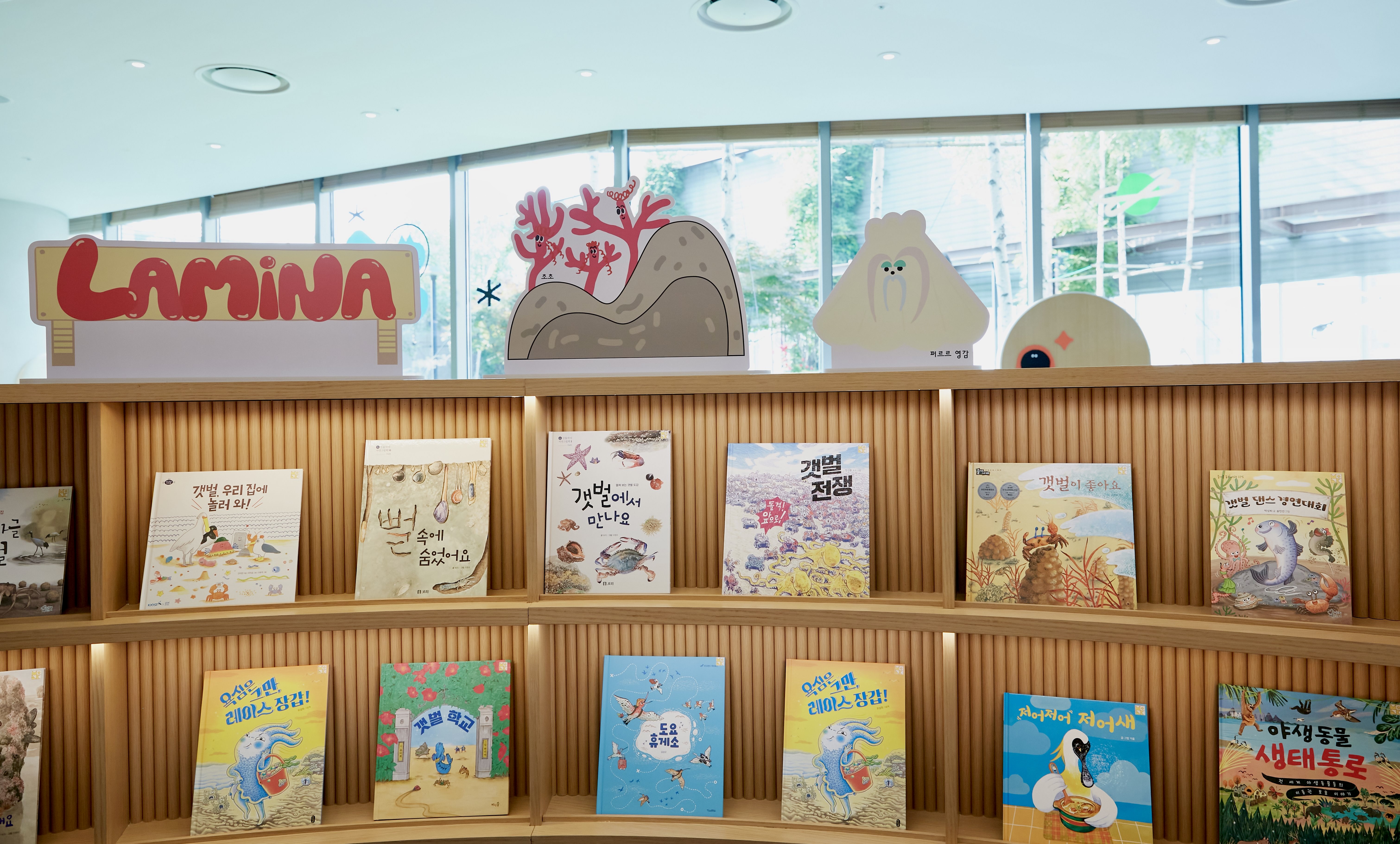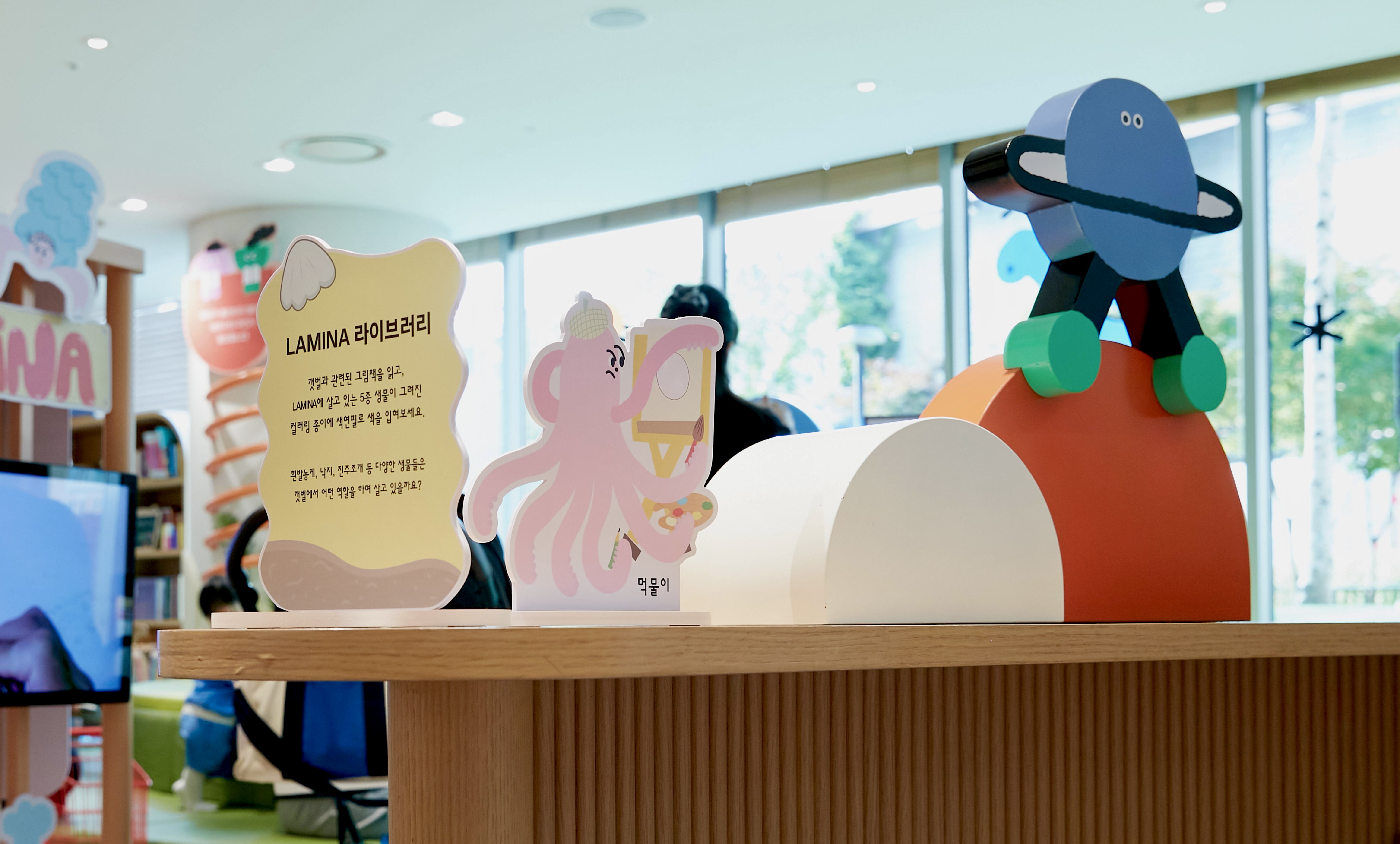 라미나2의 캐릭터와 해양 생물을 색칠하며 창의력을 발휘하고, 갯벌 관련 책을 읽으며 갯벌에 대해 더 알아보는 공간입니다.