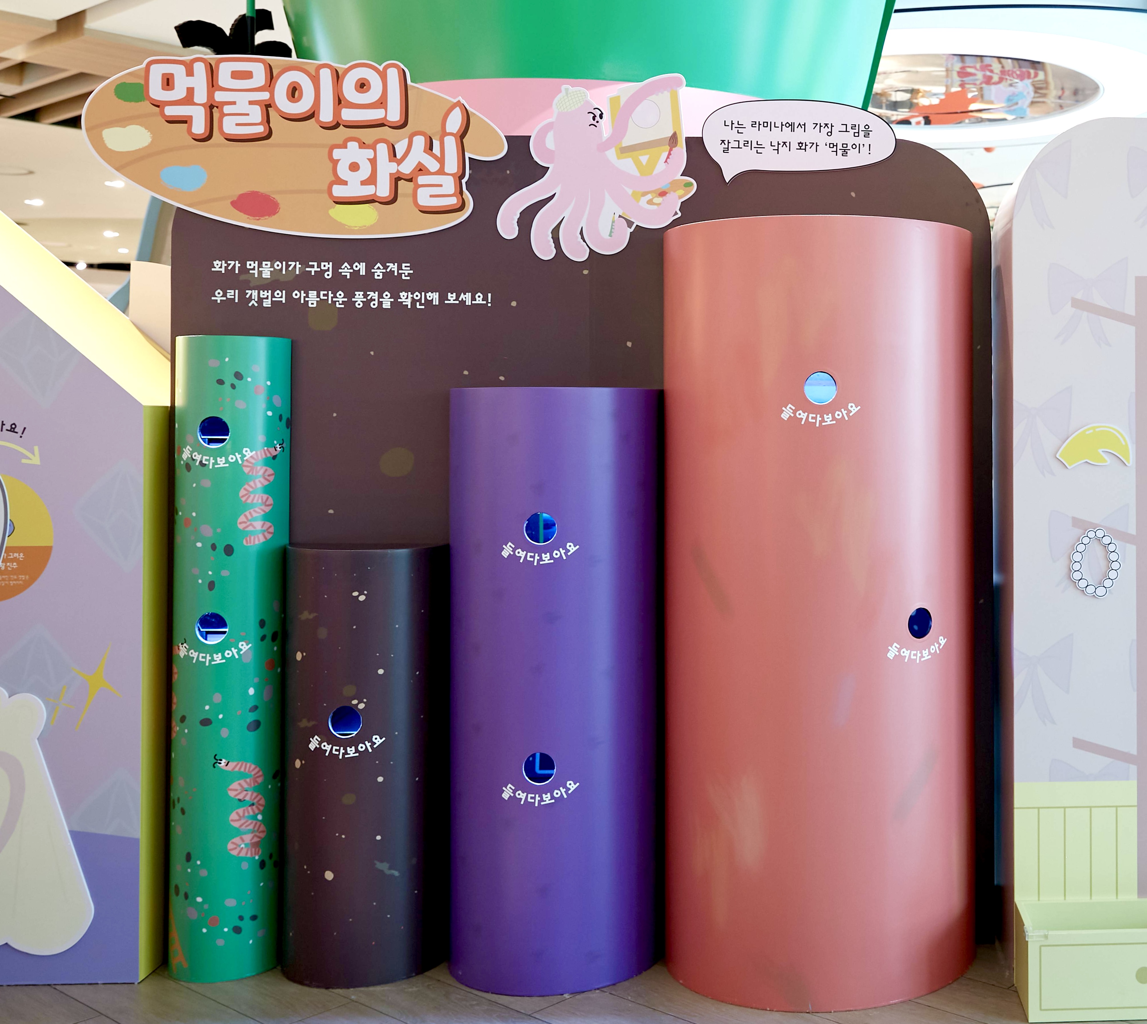 라미나 최고의 예술가 낙지 ‘먹물이’의 공간에서는 구멍을 통해 아래쪽에 숨겨진 7장의 갯벌 그림을 관찰할 수 있어요. 잠망경 거울 반사 구조를 활용한 흥미로운 시각 체험으로 아이들은 갯벌 풍경을 미술 작품처럼 바라보며 감상하는 시간을 갖습니다.