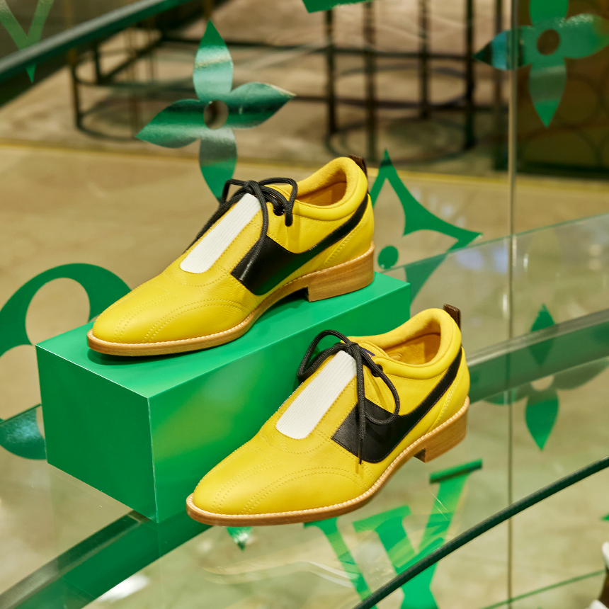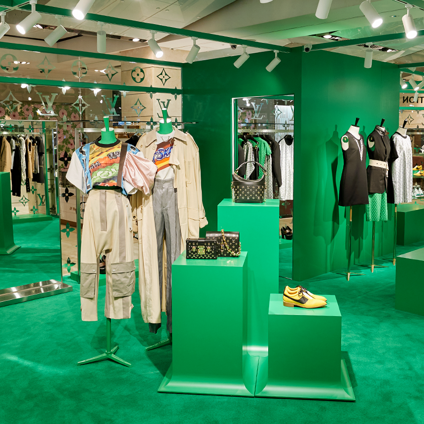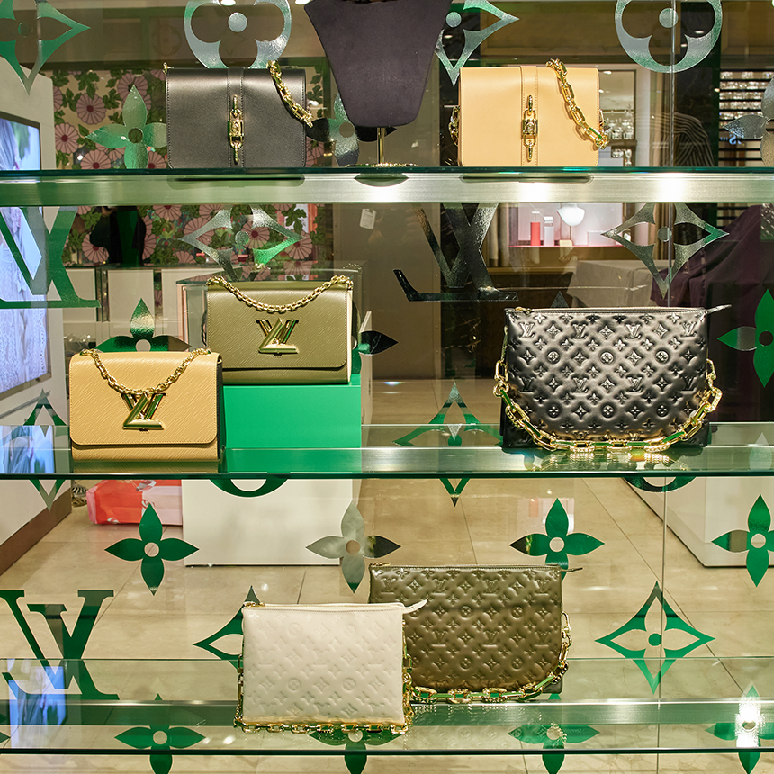 들어서자마자 초록색 배경과 루이 비통의 로고가 시선을 사로잡습니다. 루이 비통의 다양한 제품을 볼 수 있는 이번 팝업스토어는 루이 비통의 21년 SS 컬렉션을 국내 최초로 공개하는 자리입니다. 2021 봄-여름 여성 컬렉션 패션쇼에서 선보였던 초록색 크로마키 배경에서 영감을 받았는데요. 간결하면서도 미래적인 느낌으로 이번 시즌 제품들을 다루고 있습니다.