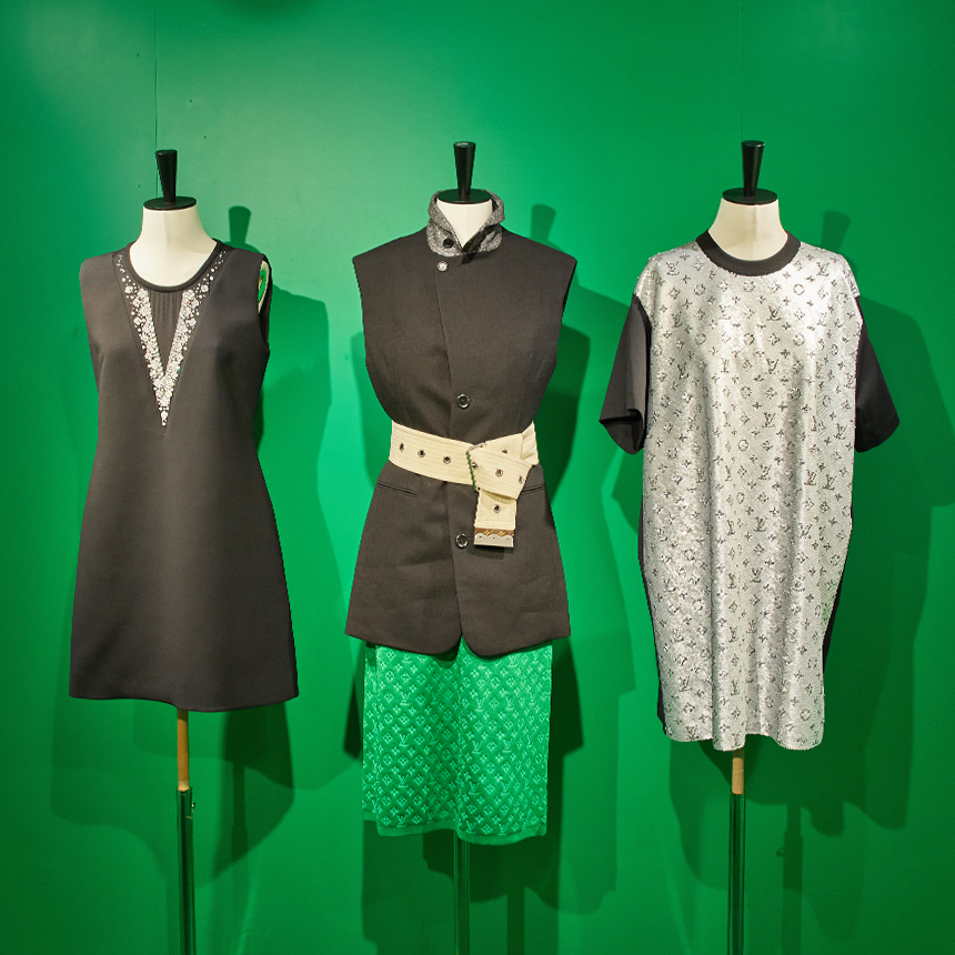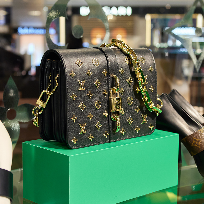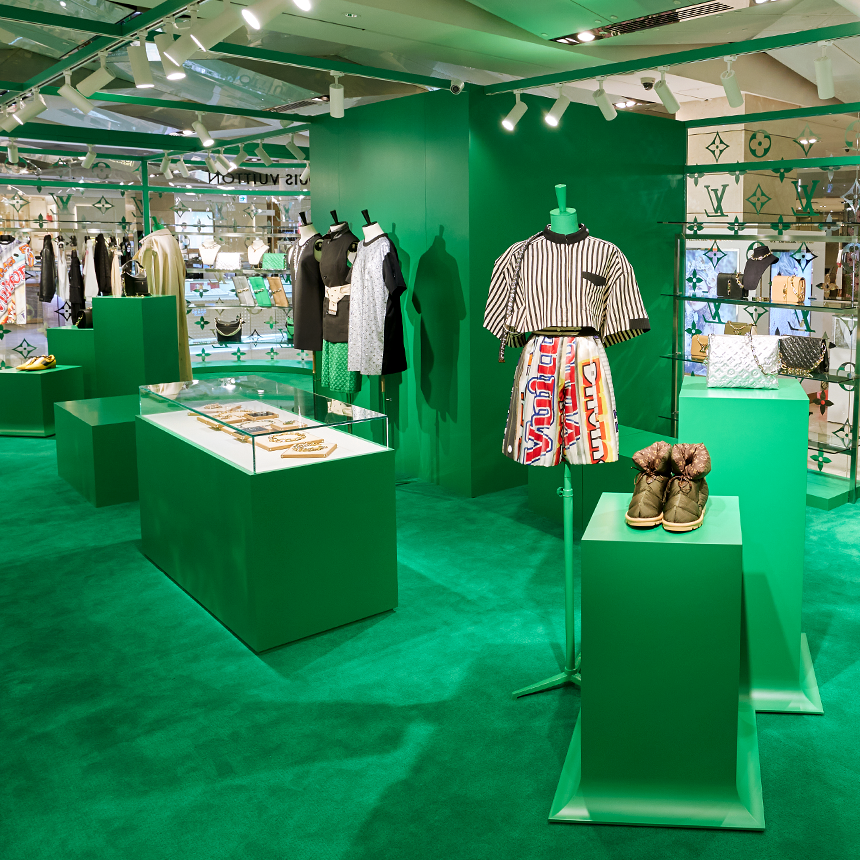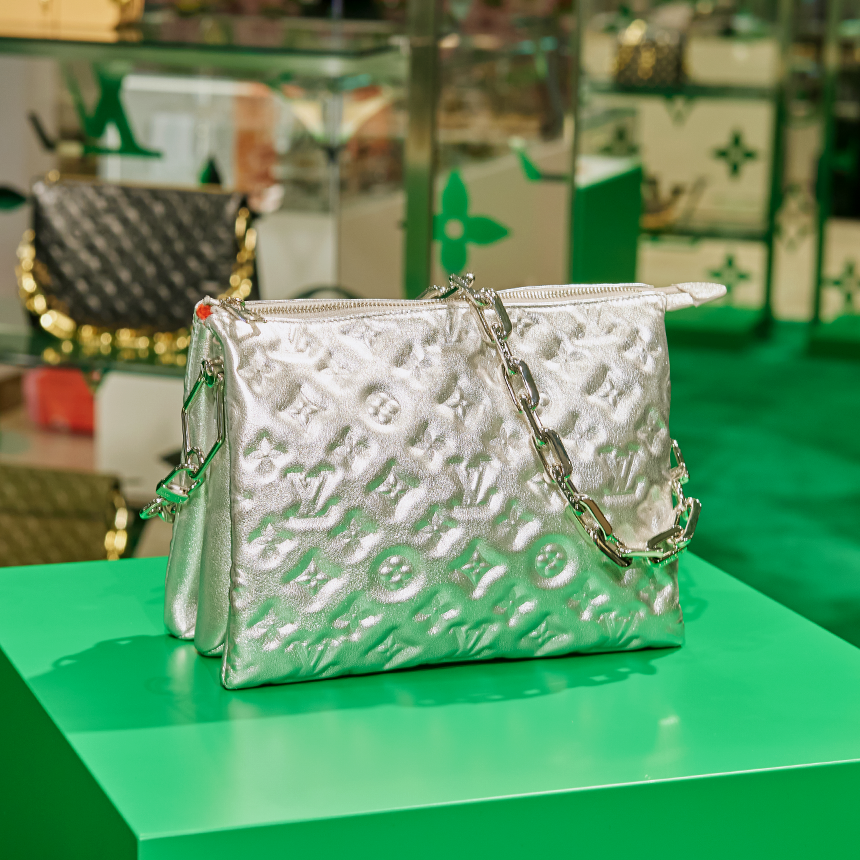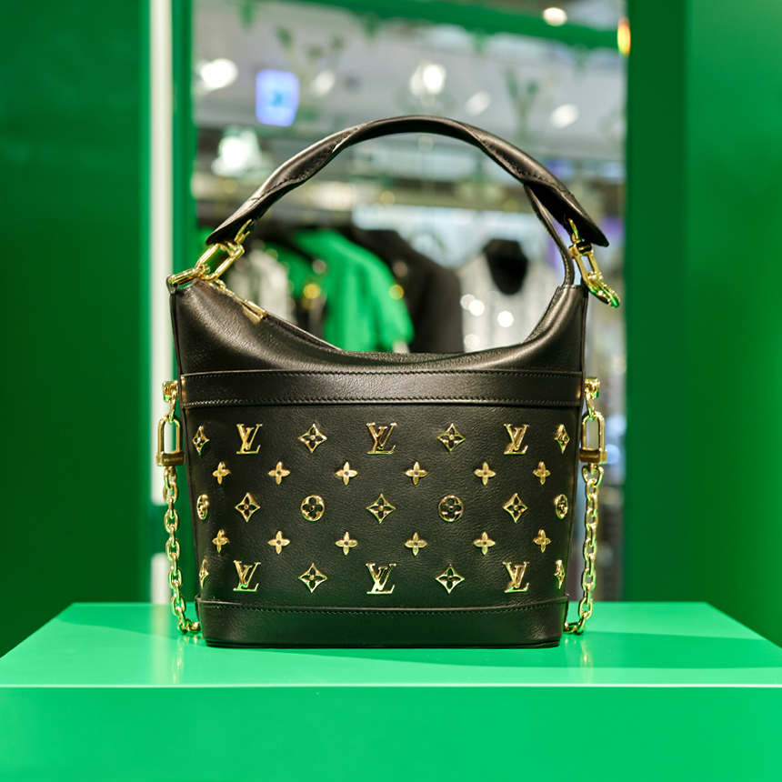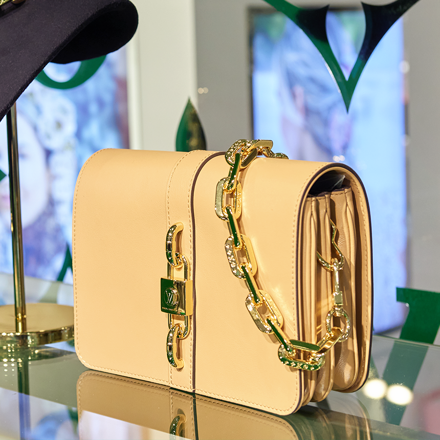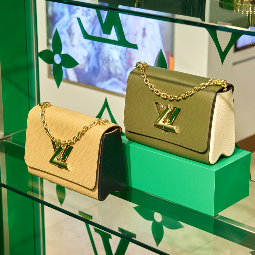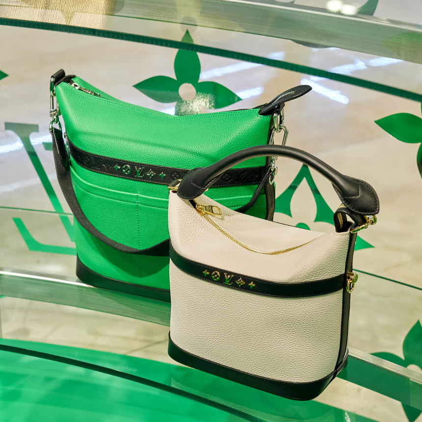 들어서자마자 초록색 배경과 루이 비통의 로고가 시선을 사로잡습니다. 루이 비통의 다양한 제품을 볼 수 있는 이번 팝업스토어는 루이 비통의 21년 SS 컬렉션을 국내 최초로 공개하는 자리입니다. 2021 봄-여름 여성 컬렉션 패션쇼에서 선보였던 초록색 크로마키 배경에서 영감을 받았는데요. 간결하면서도 미래적인 느낌으로 이번 시즌 제품들을 다루고 있습니다.