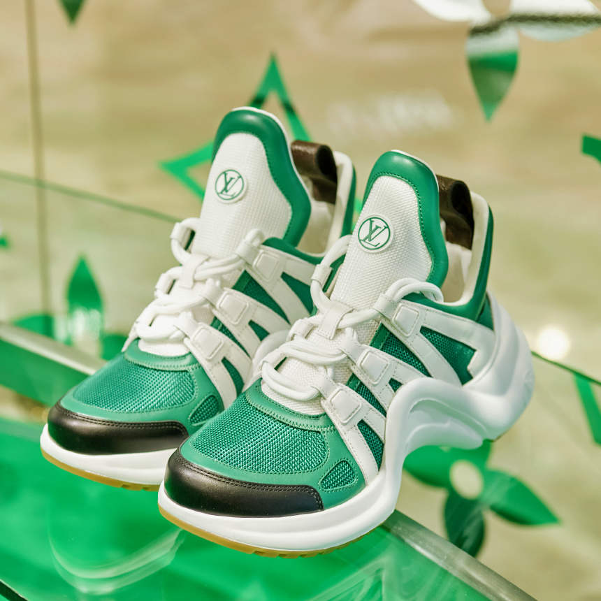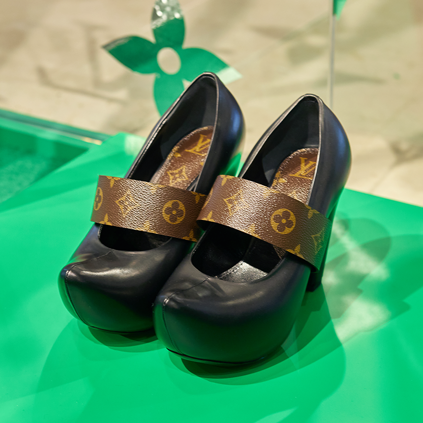 구조적이고 과장된 실루엣이 돋보이는 퍼피 플랫폼 펌프스입니다. 패딩 처리한 블랙 색상의 송아지 가죽 소재로, 루이 비통의 아이코닉한 모노그램 캔버스 소재의 넓은 스트랩이 돋보이는데요. 아티스틱 디렉터 니콜라 제스키에르가 나무 소재의 덴마크 전통 슈즈에서 영감을 받아 디자인했습니다. 스타일리시하고 미니멀한 디자인과 함께 청키하면서도 매우 가벼운 아이템입니다.