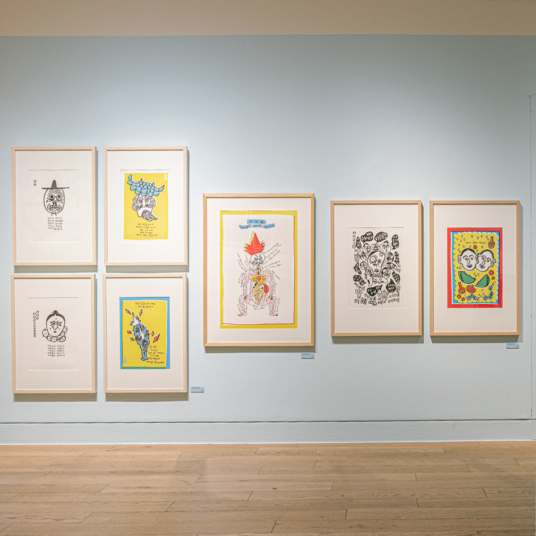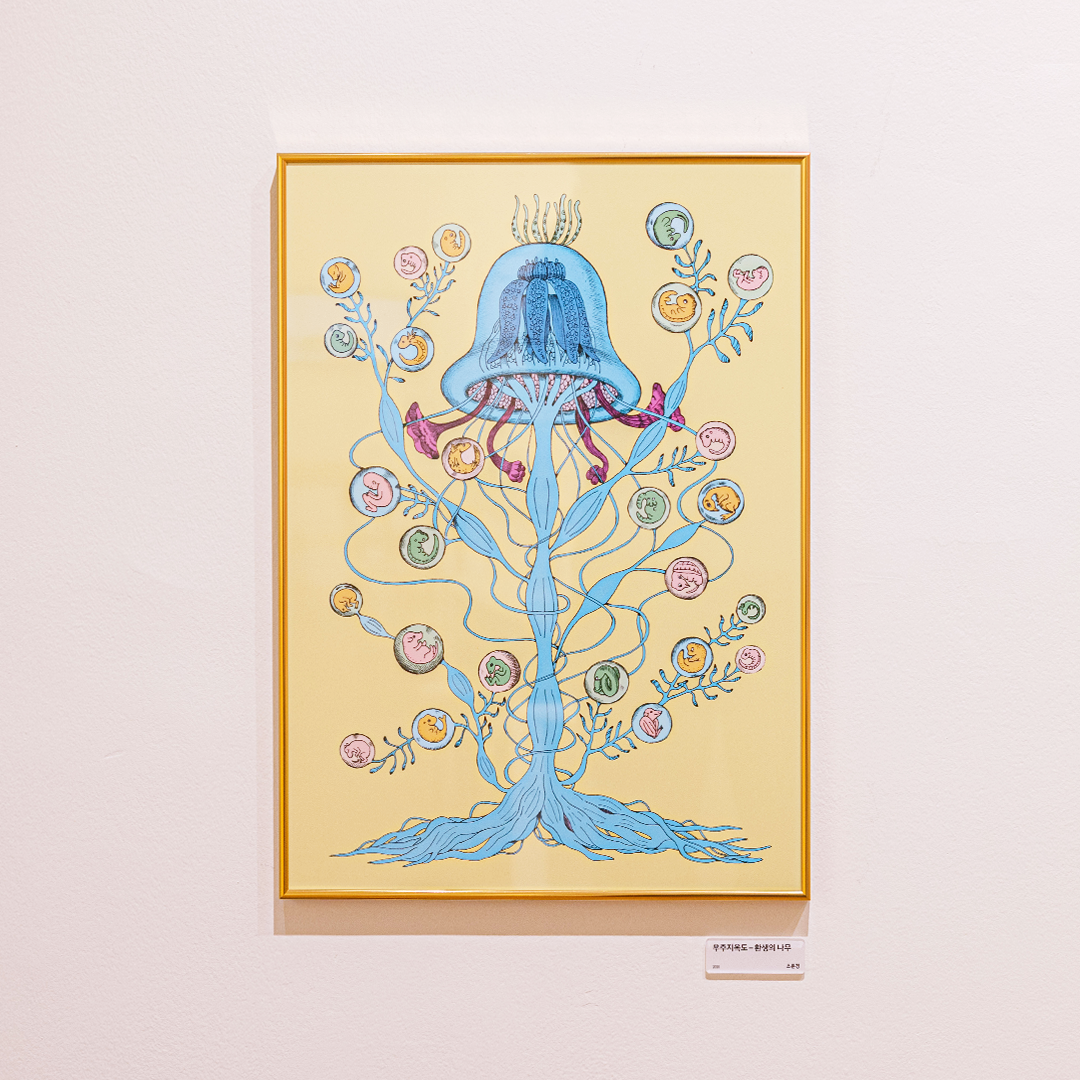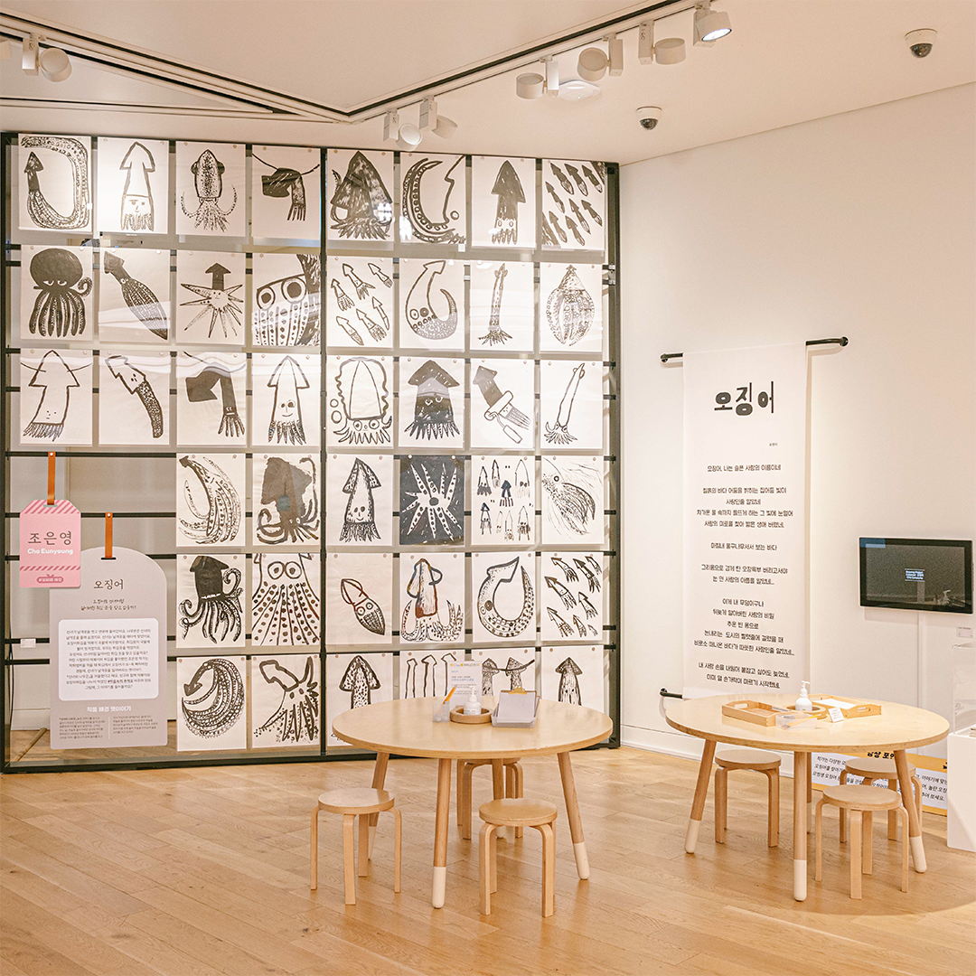 튀김옷이 벗겨져 쏙 빠져나온 오징어가 왠지 날개 잃은 선녀처럼 슬퍼 보이지 않나요? 오징어 먹물로 그린 듯한 조은영 작가의 『오징어』에서 힘없는 오징어, 놀란 오징어, 모범생 오징어 등 다양한 오징어와 그들의 감정을 찾아볼 수 있는데요. 이 작품은 작가가 어린 시절 오징어 튀김을 먹던 기억에서 시작했다고 해요. 한편에 전시된 작가의 어린 시절 추억의 물건들도 함께 보면 그때 그 시절로 나 또한 돌아간 거 같네요.