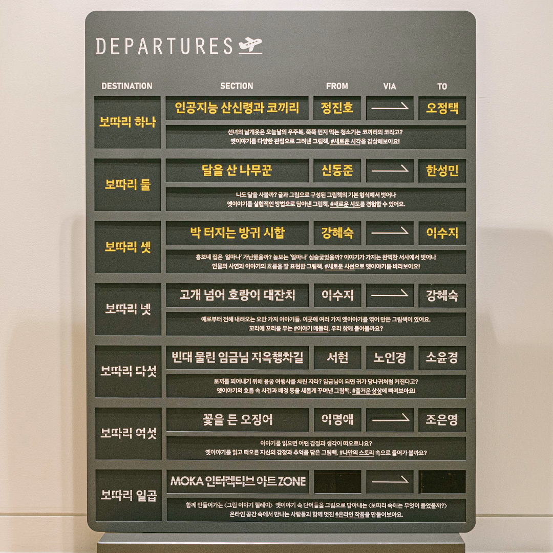 옛이야기를 새롭고 독특하게 옮겨 담은 일곱 개의 보따리를 펼쳐 놓은 <#보따리바캉스>와 작가들의 창가를 살짝 열어보는 <창밖을 보라>까지, 지금 현대어린이책미술관은 그림과 같은 이야기와 이야기처럼 재미있는 그림으로 가득해요. 전시장에 마련된 리딩존에서 전시 중인 그림책을 바로 읽을 수 있을 뿐만 아니라, MOKA SHOP에서 구입도 가능한데요. 전시를 모두 감상하고 집으로 돌아가는 길, 아이가 계속해서 옛이야기를 물어볼지도 몰라요. 일상을 그림책처럼 바꾸는 보따리를 아이들과 함께 풀어보세요.